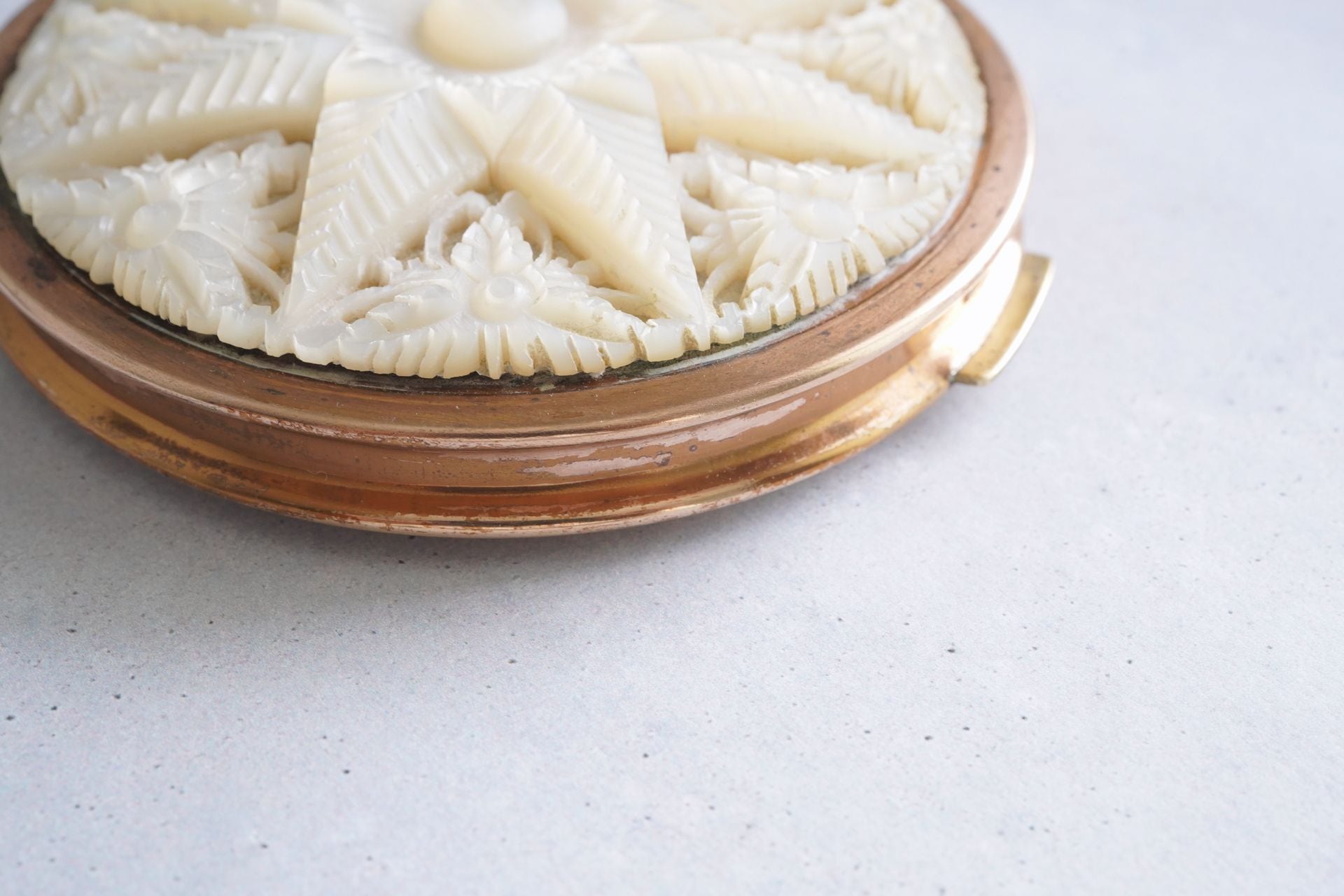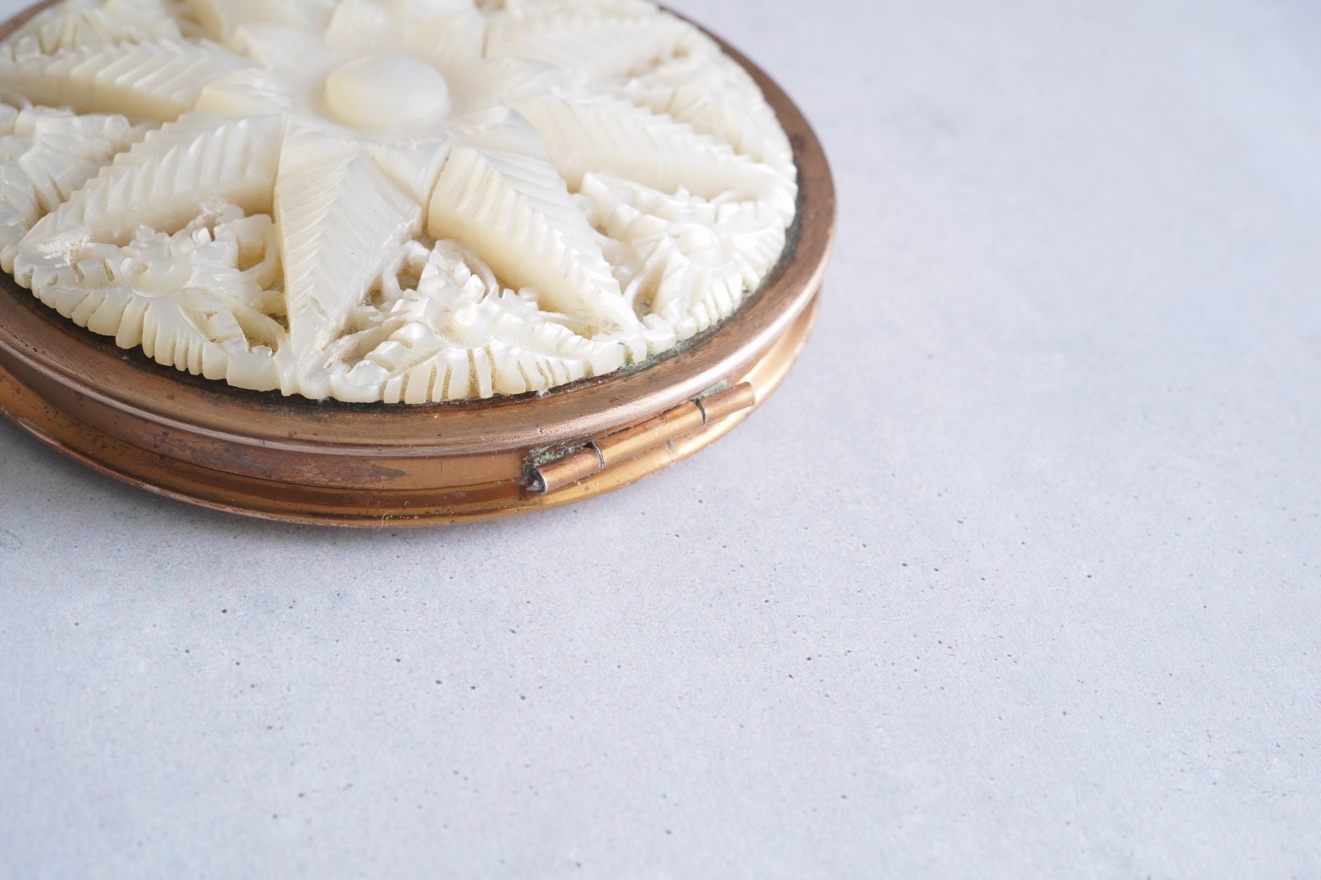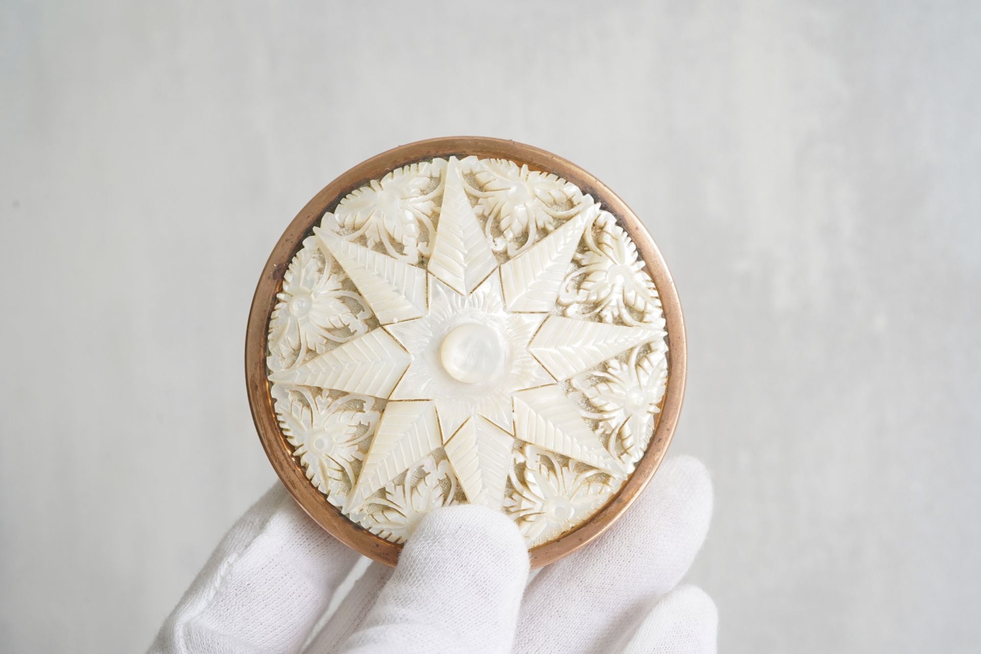 フタ部分の白蝶貝にはかつての職人さんによる繊細な手彫りが残されています。