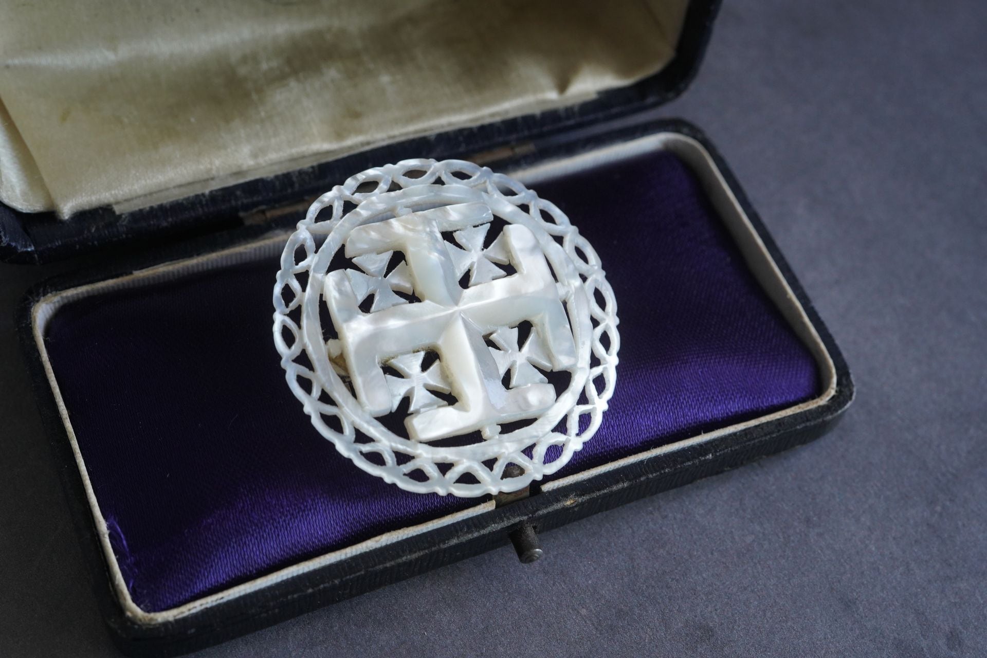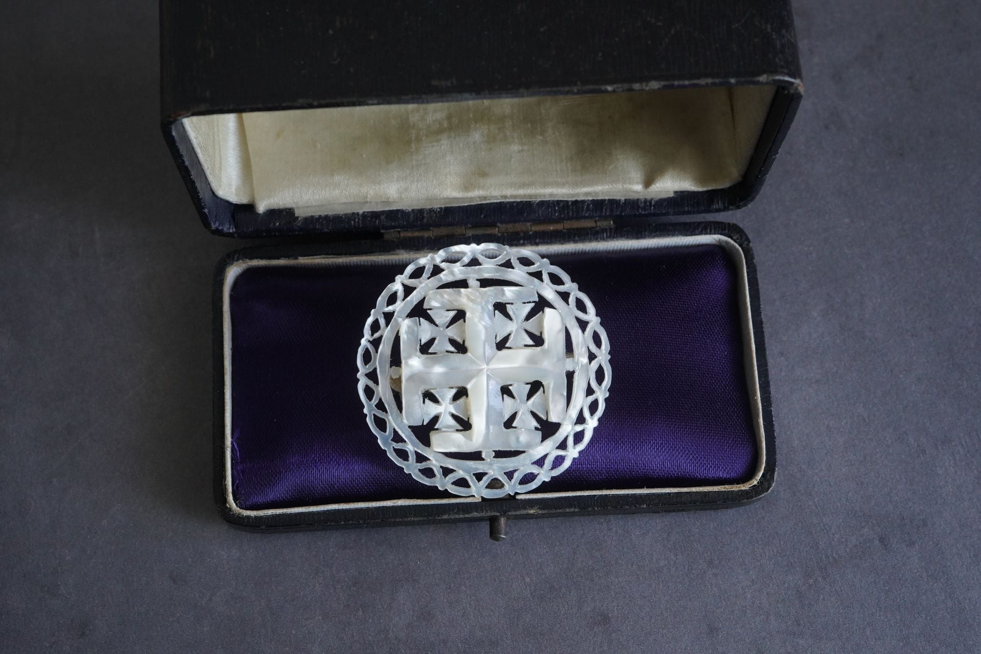 白蝶貝に手彫りが施されたベツレヘムの古いブローチです。