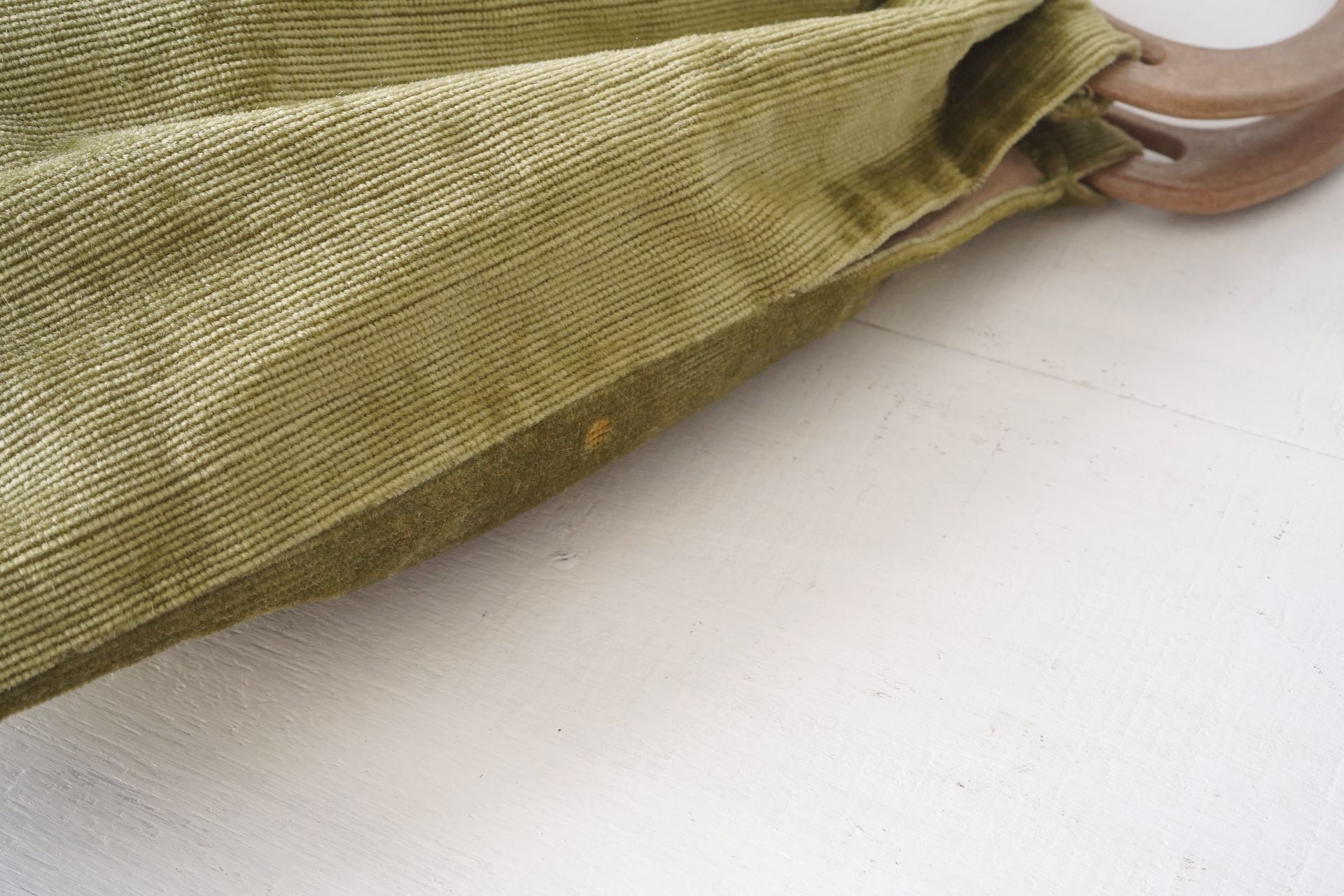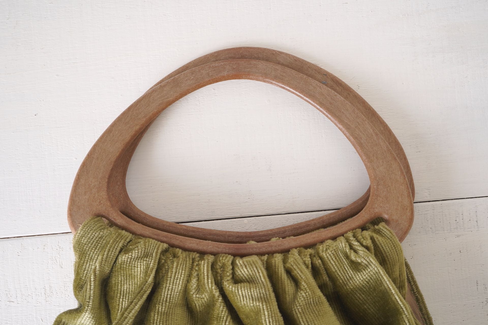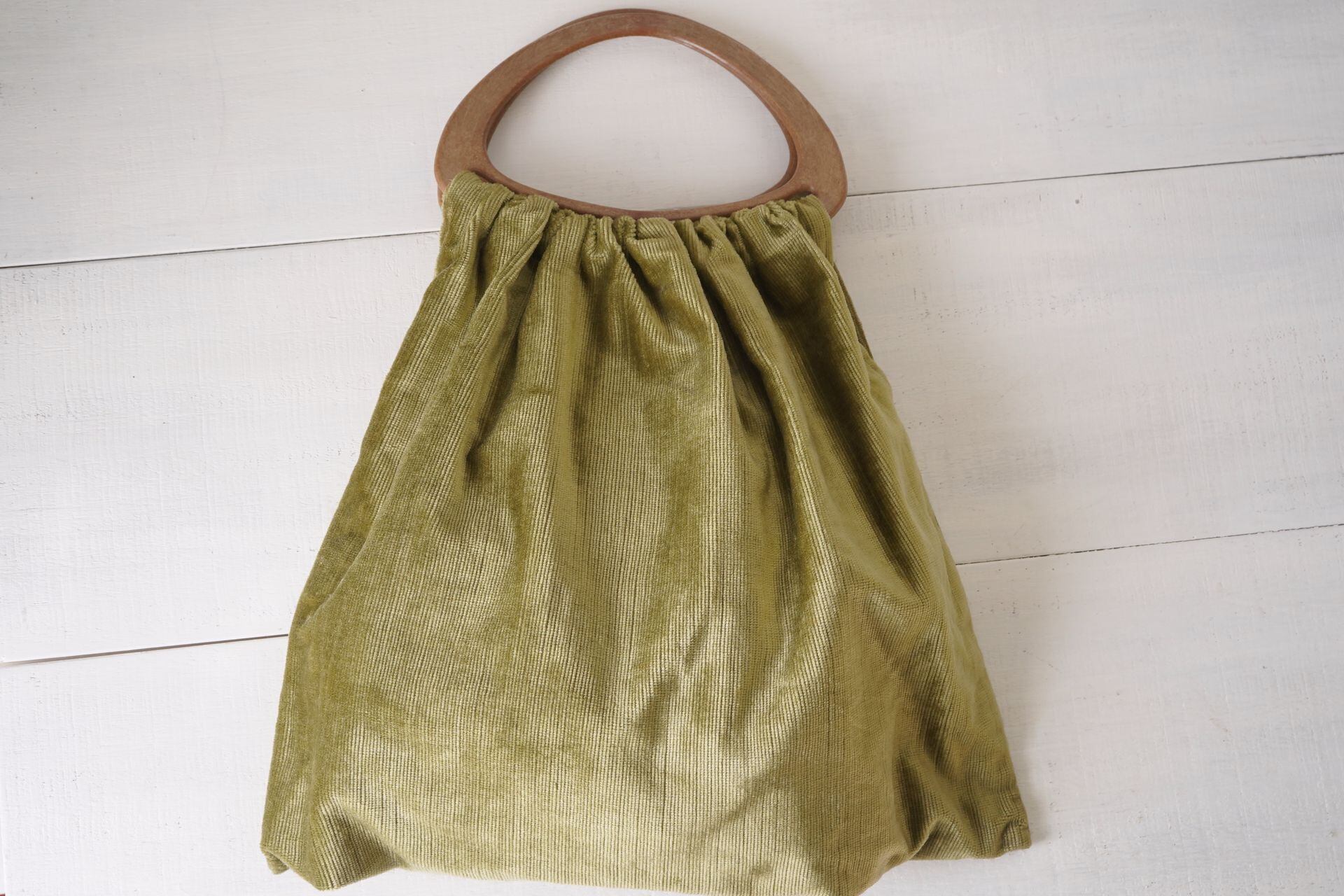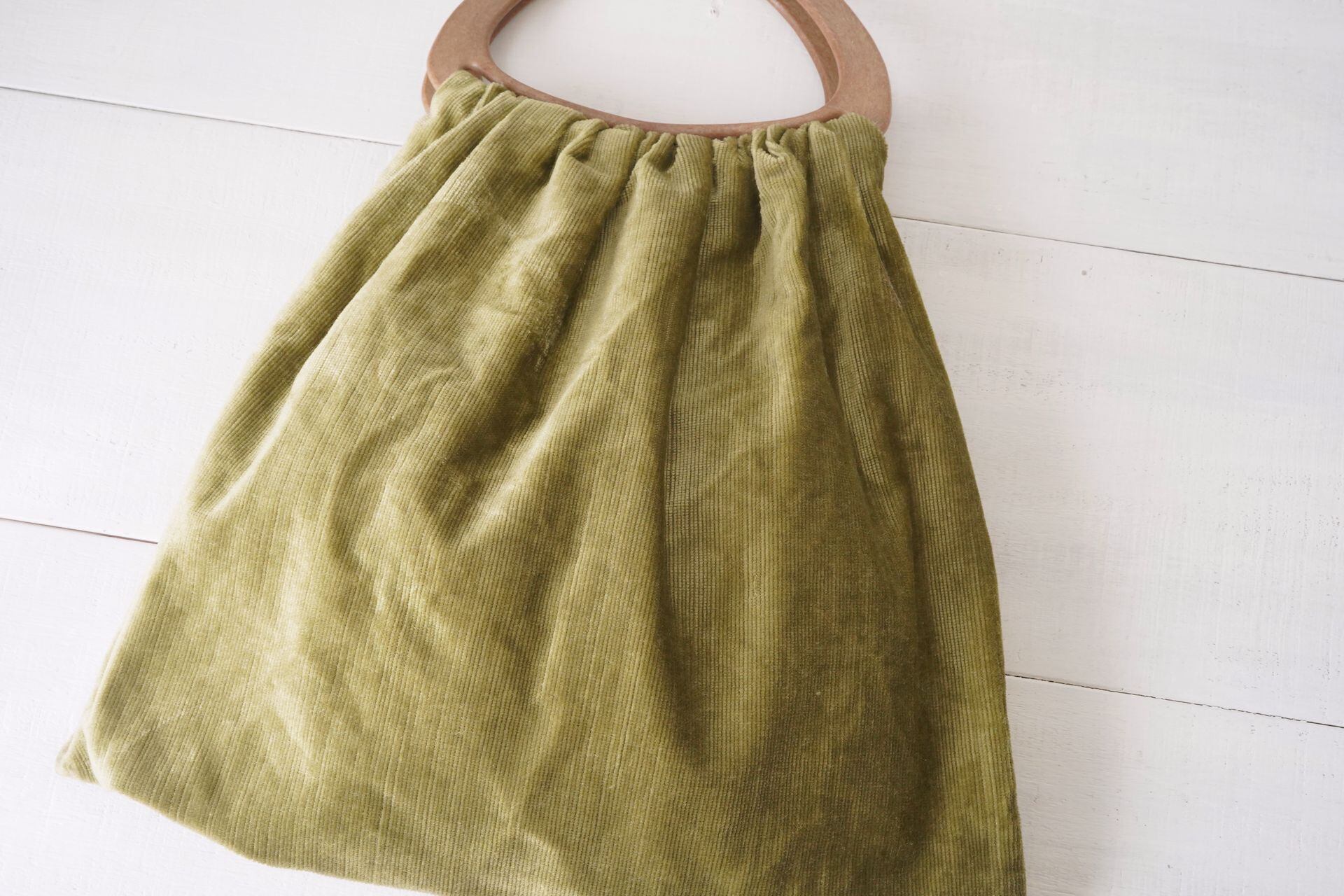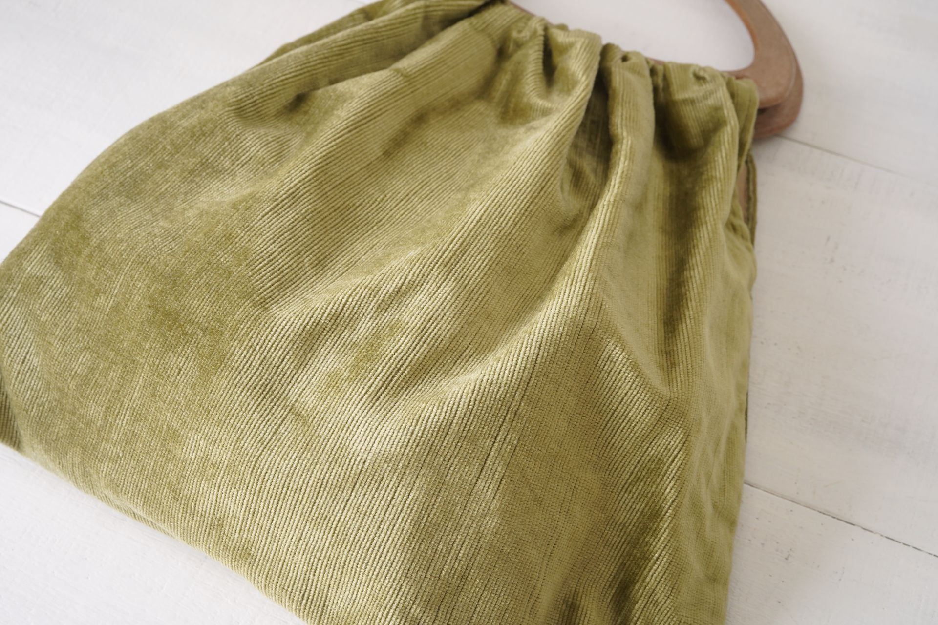 光沢感のあるコーデュロイ生地に素朴な木の持ち手。