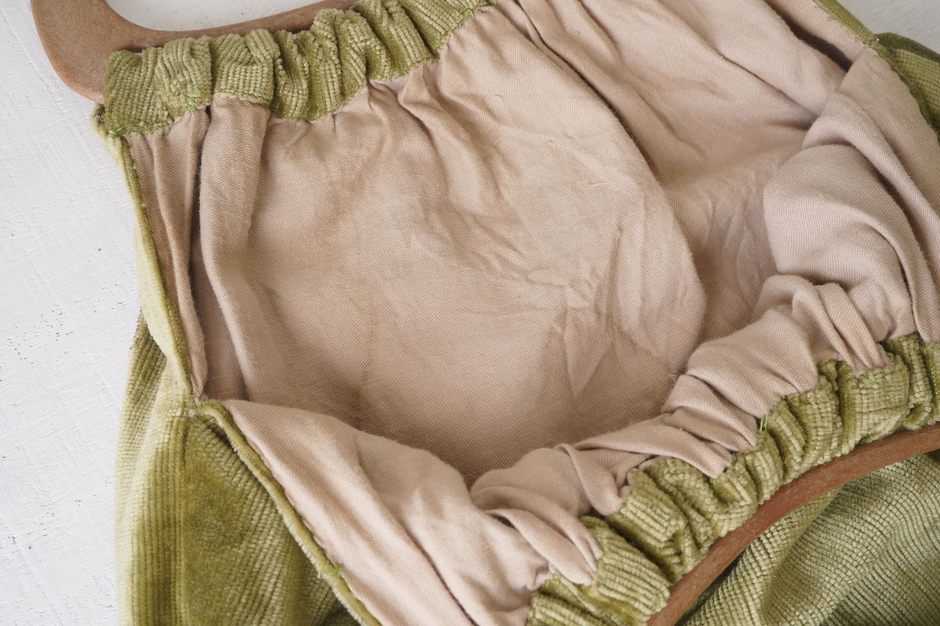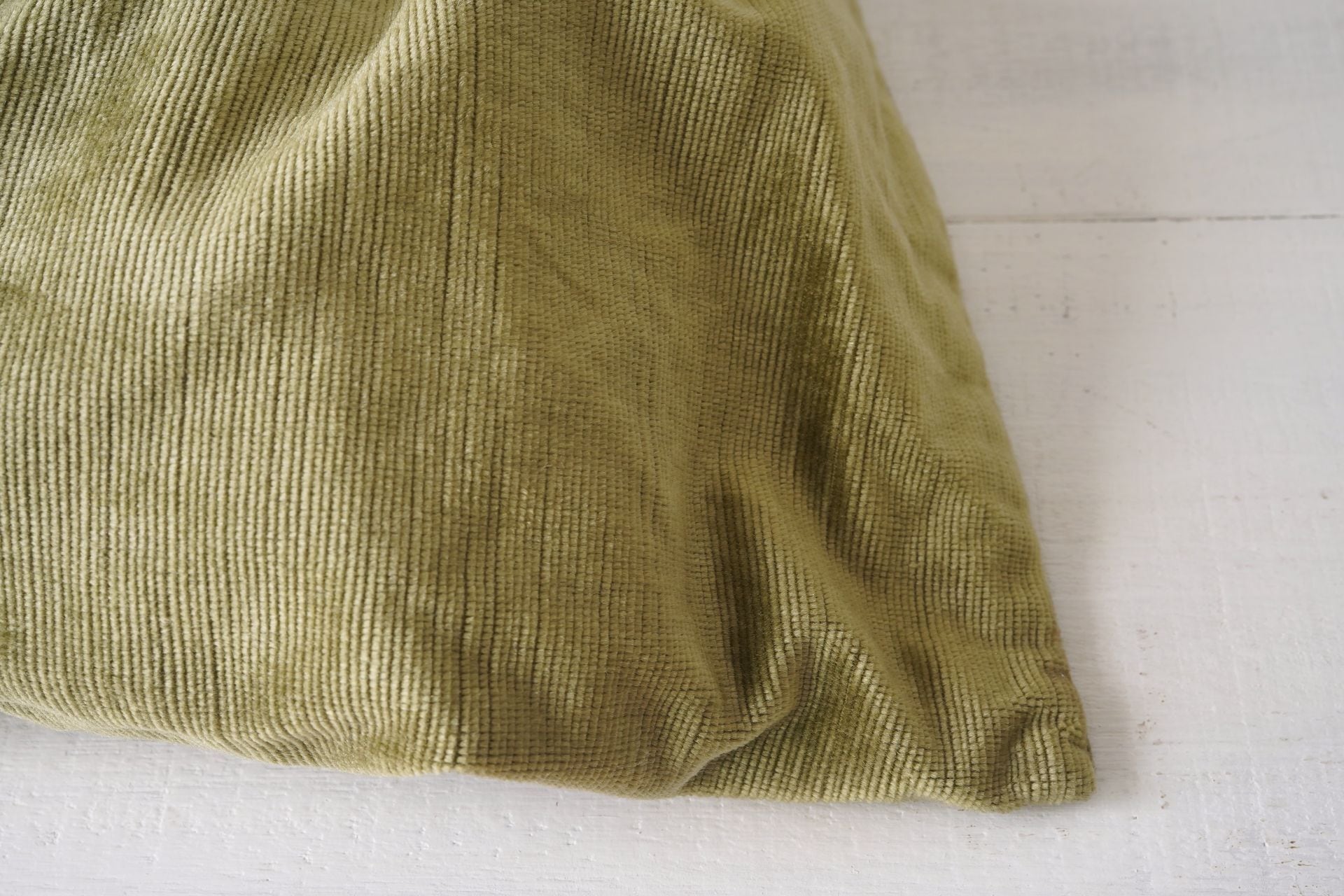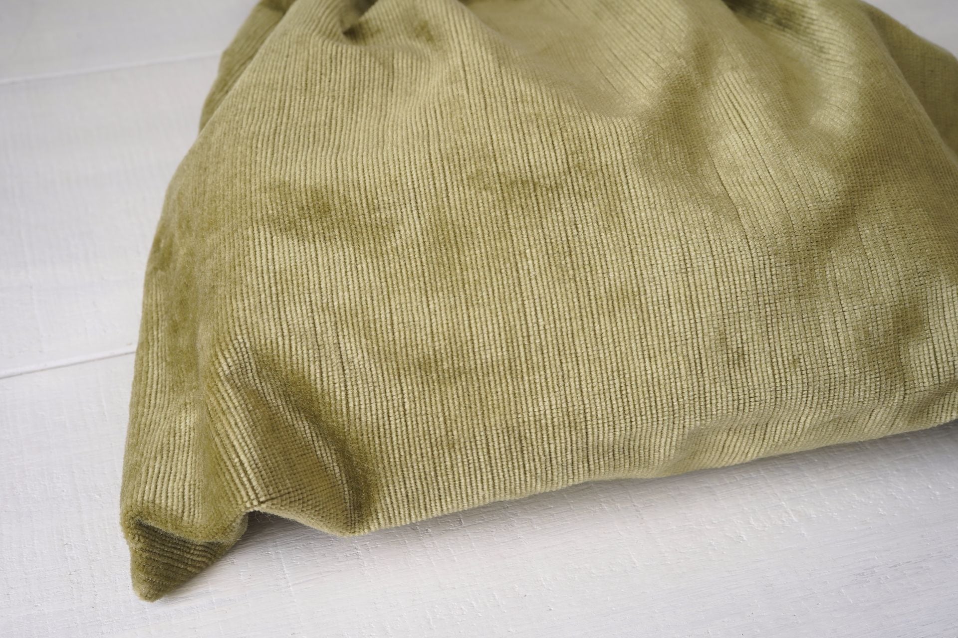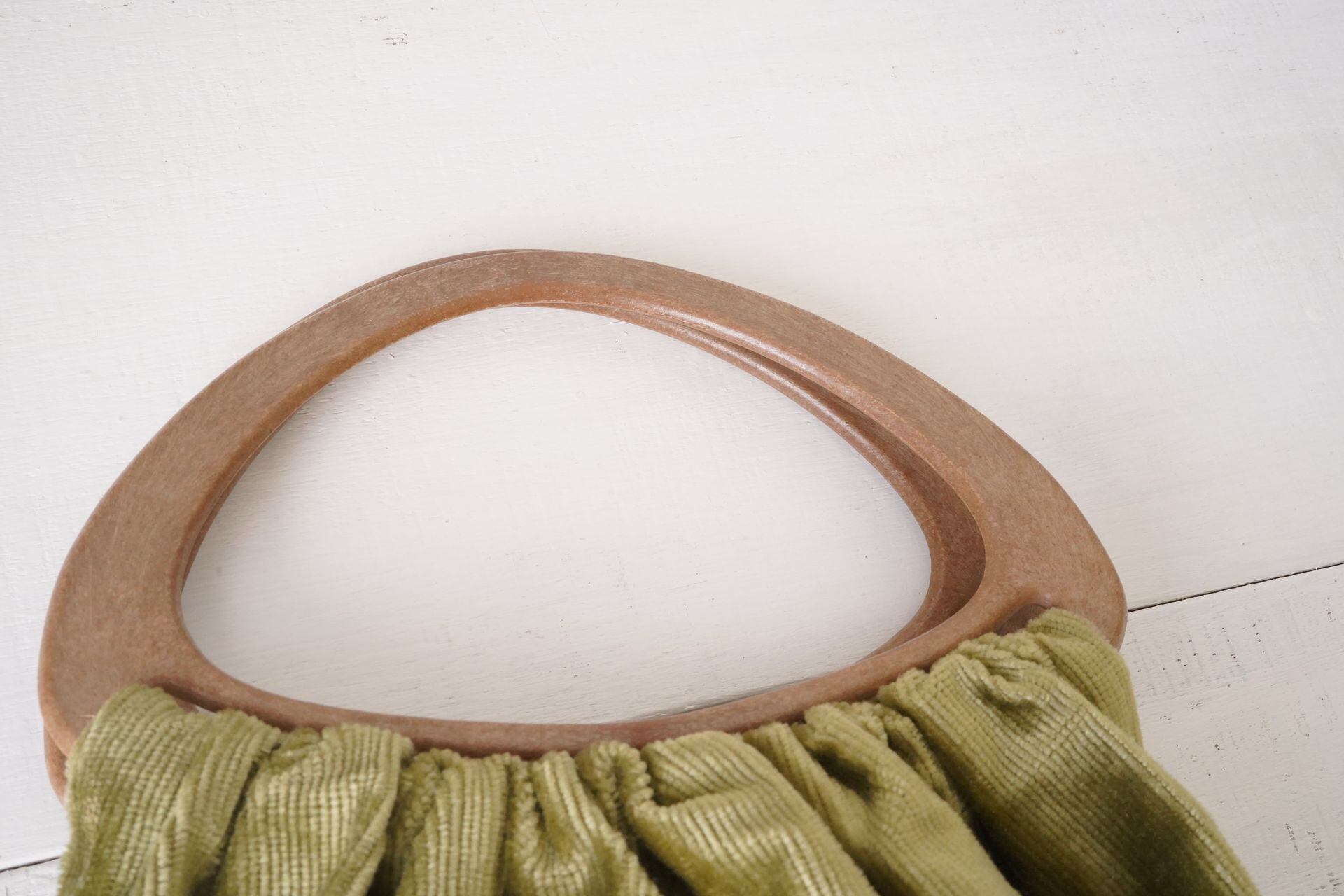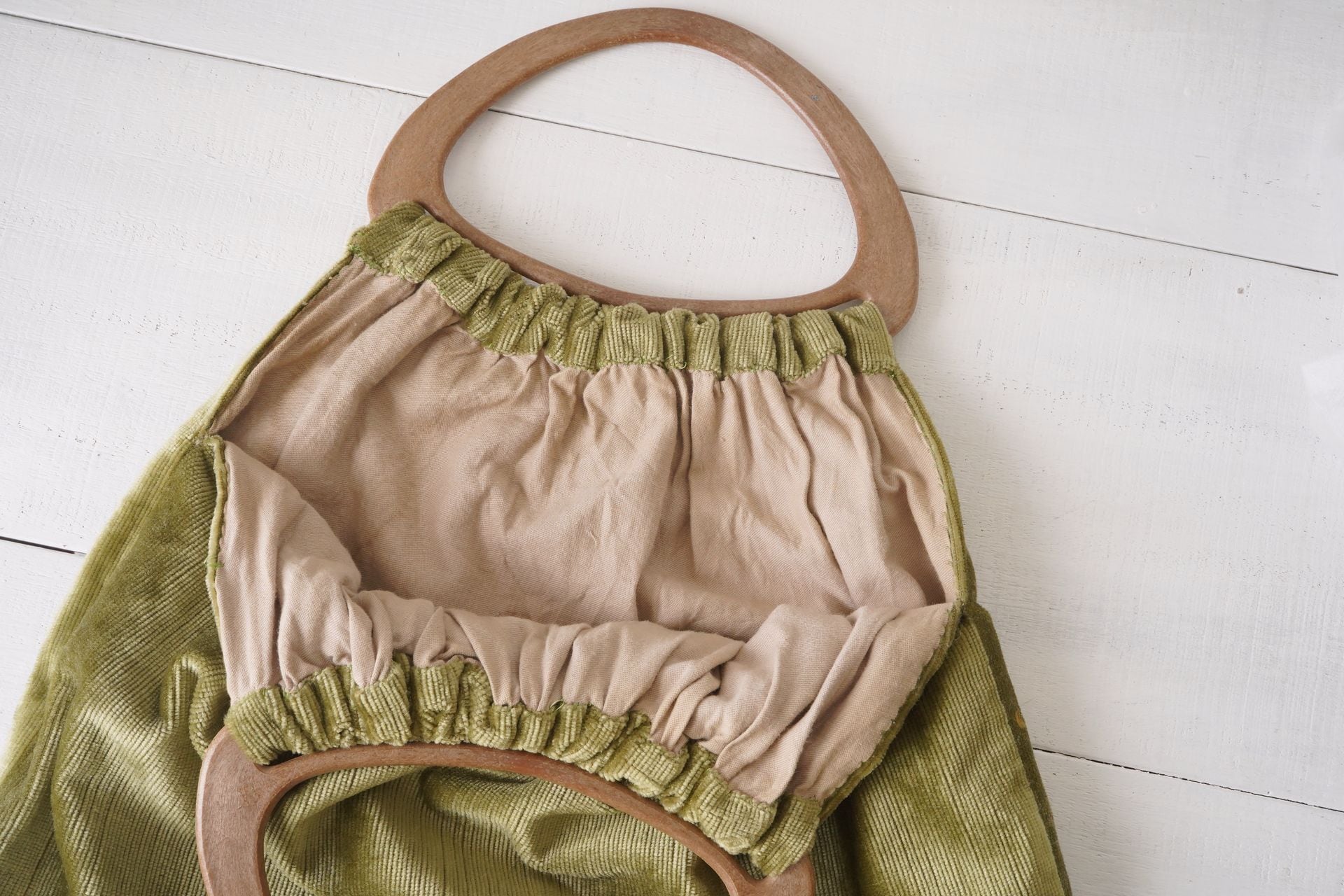 光沢感のあるコーデュロイ生地に素朴な木の持ち手。