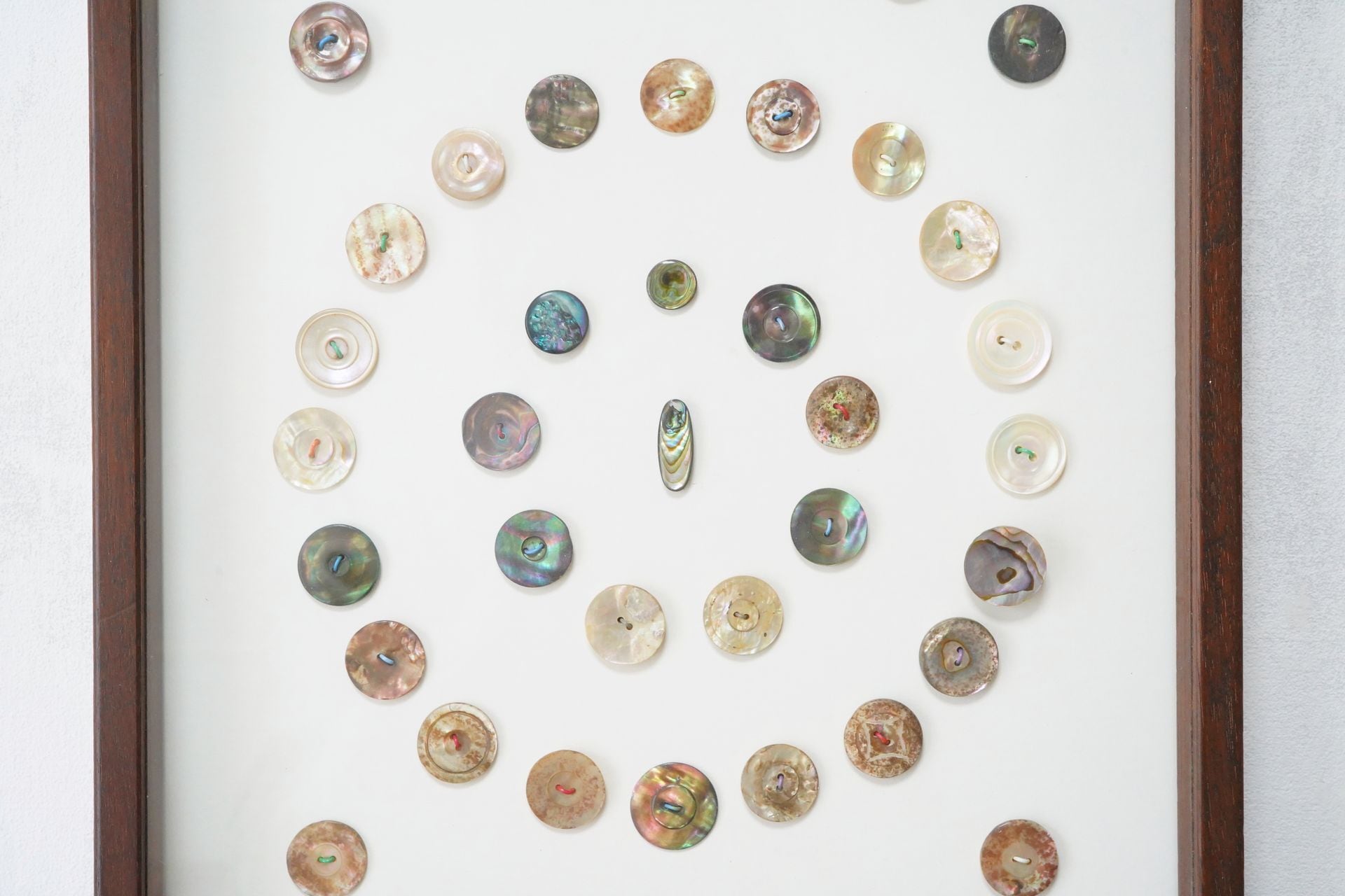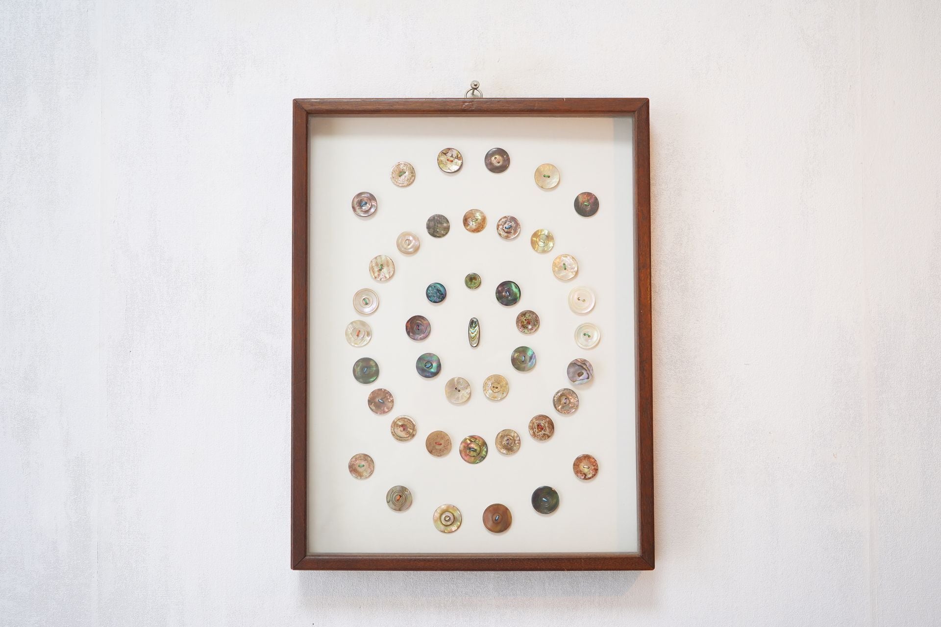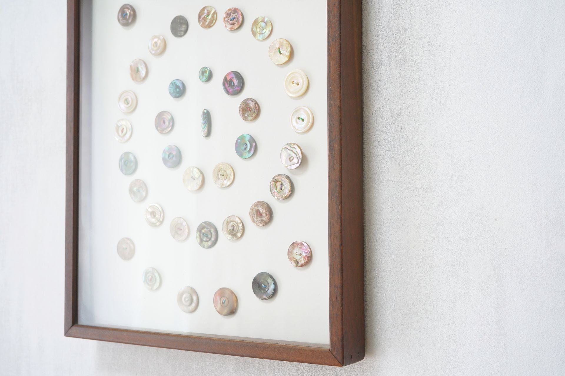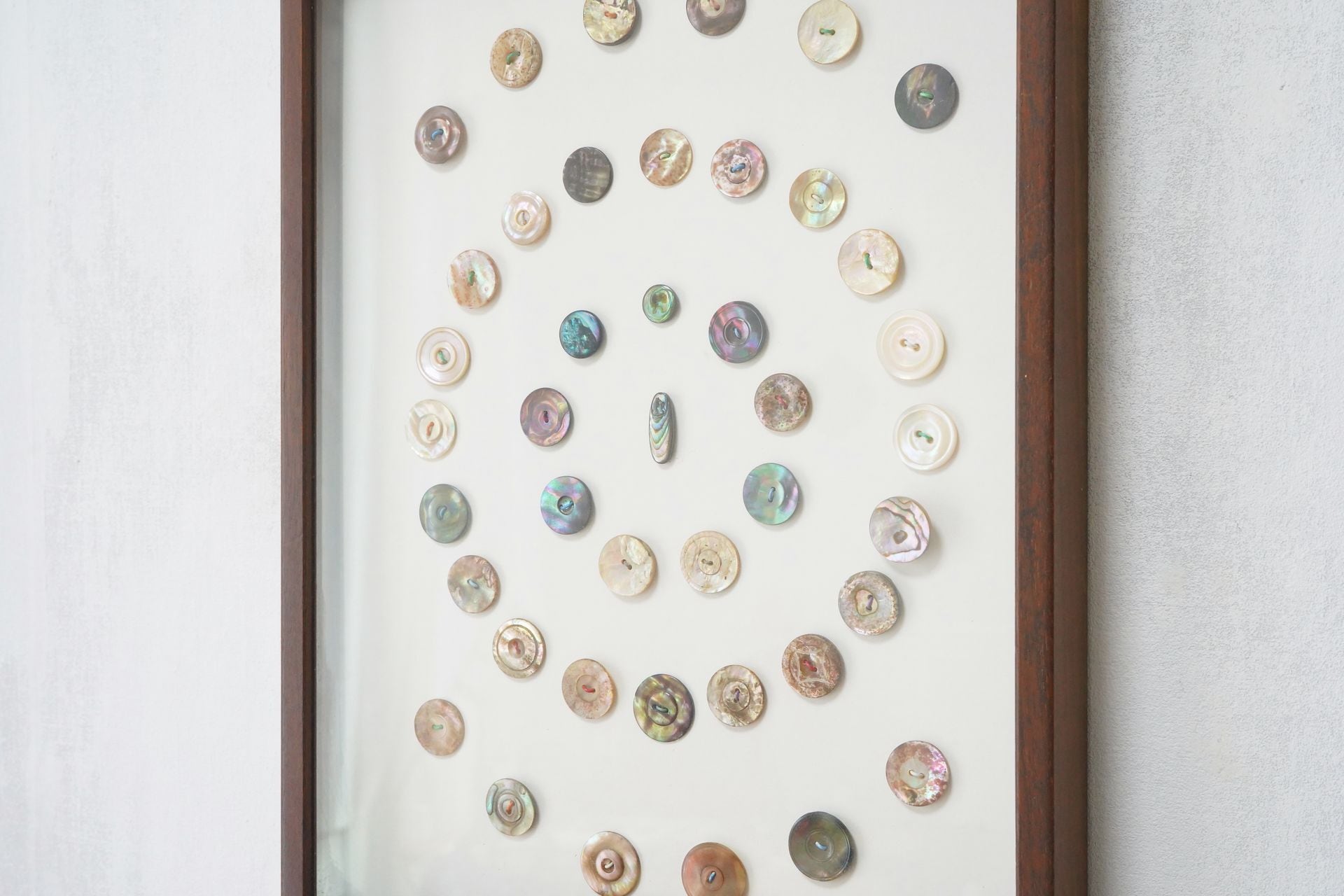 美しい貝ボタン42個をまるで標本のように眺めることができます。