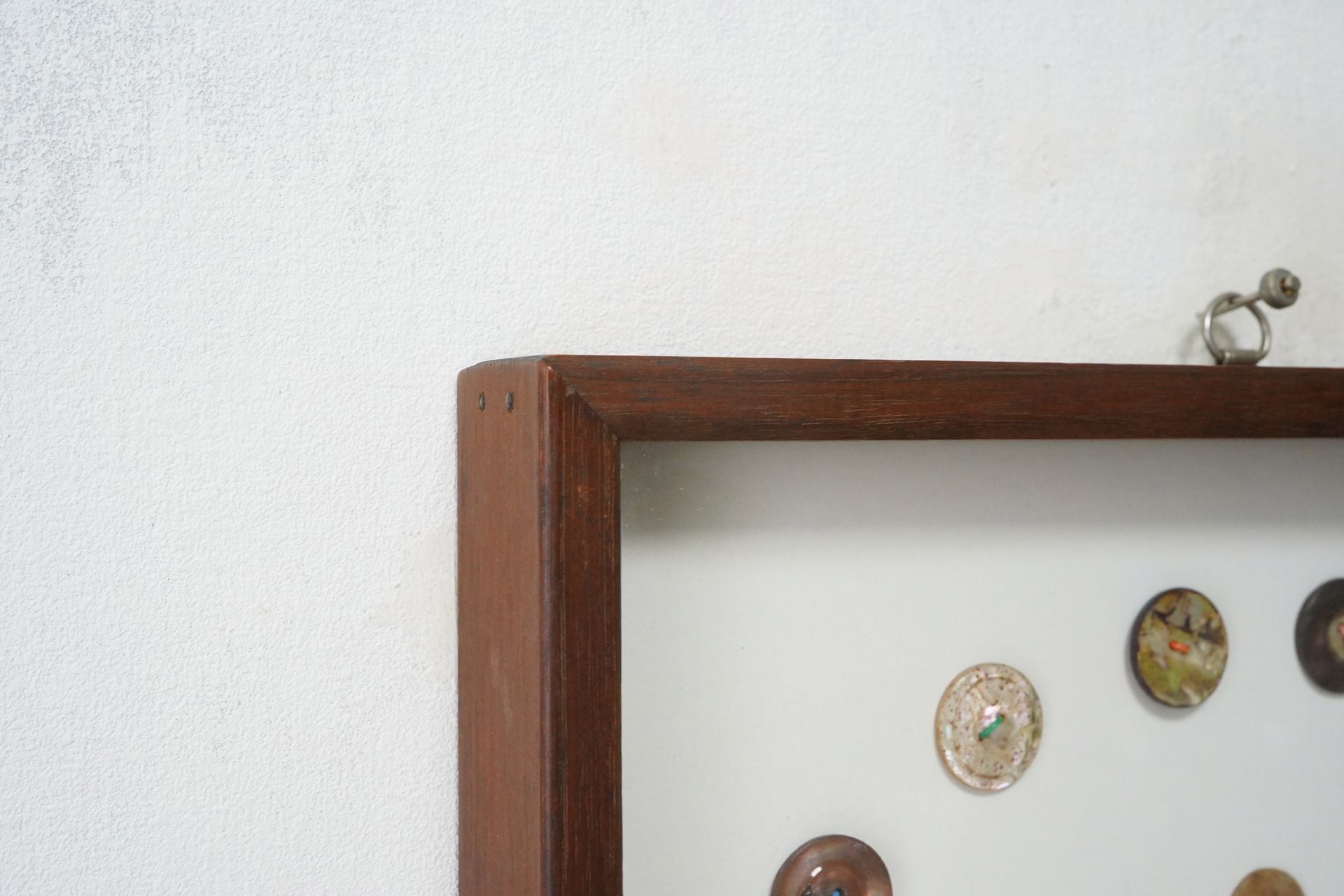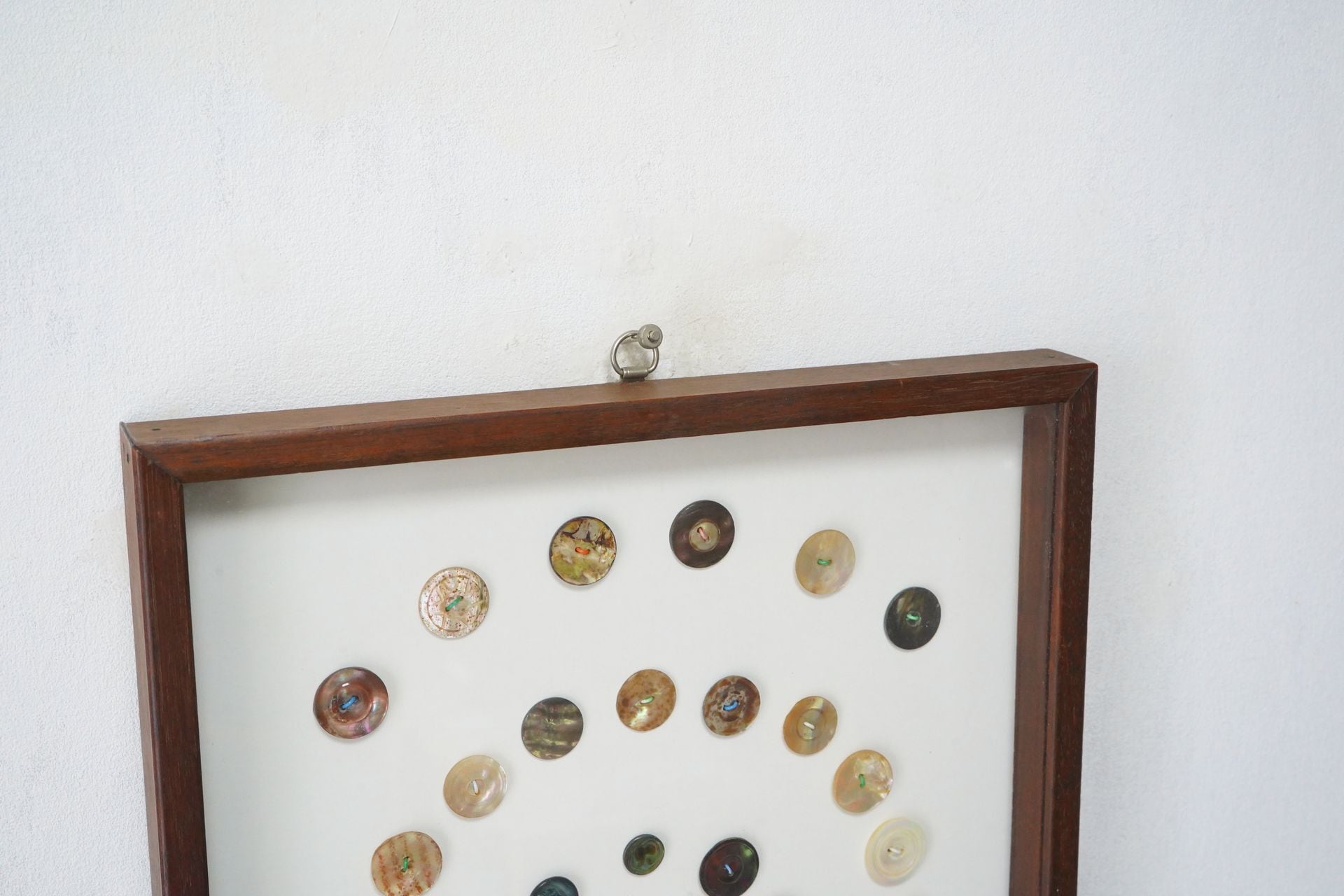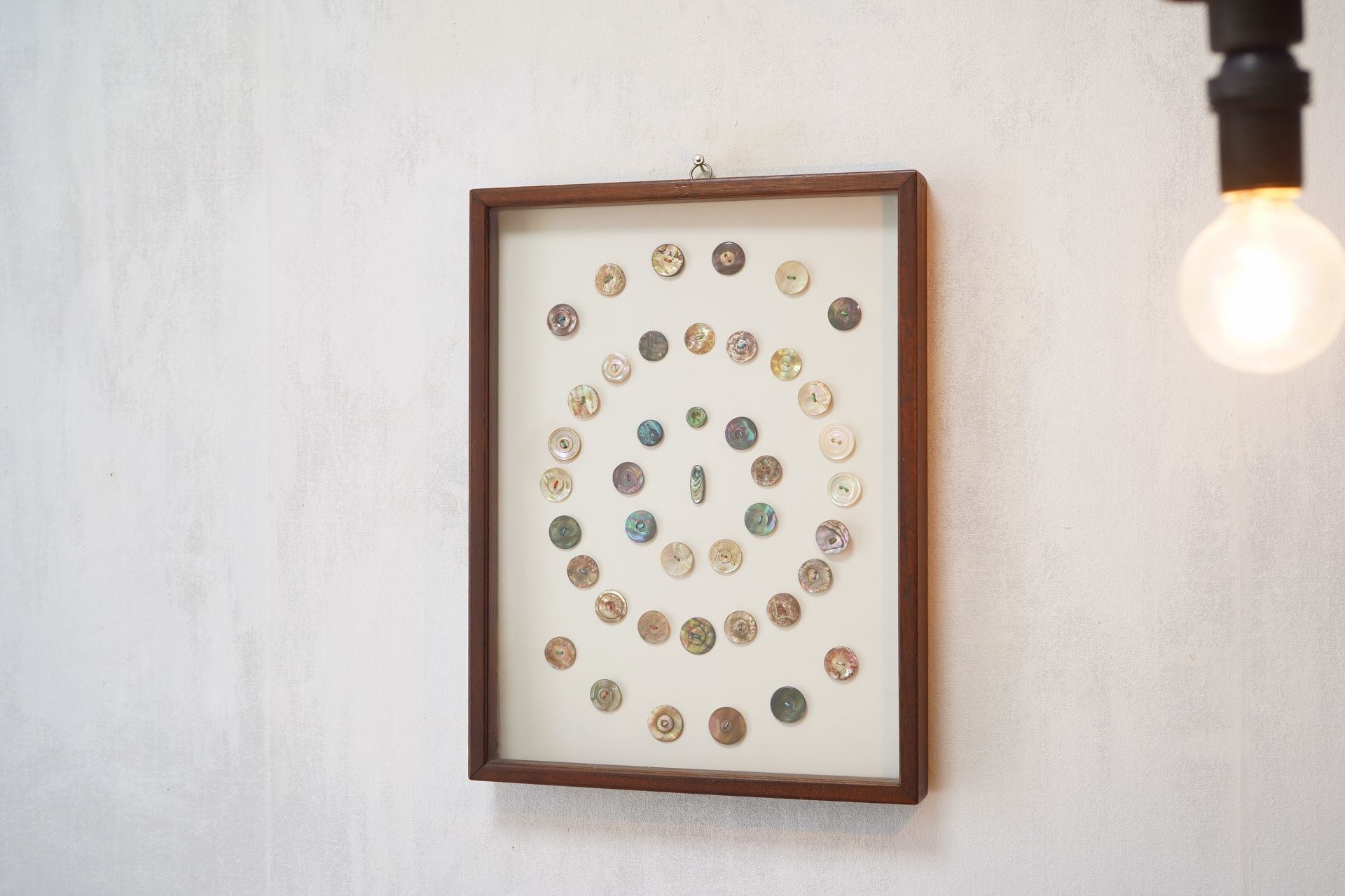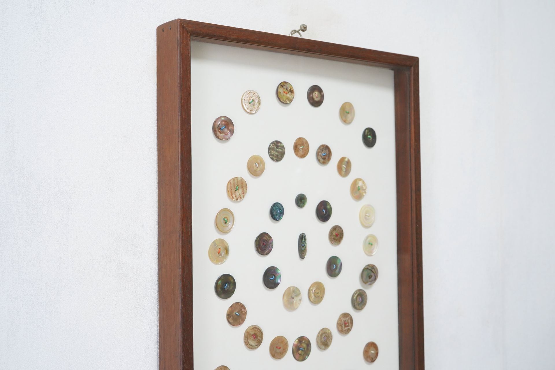 美しい貝ボタン42個をまるで標本のように眺めることができます。