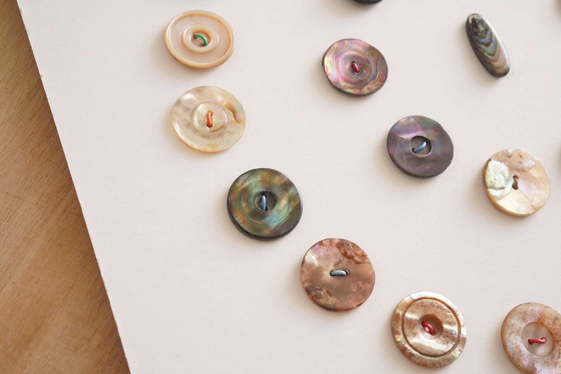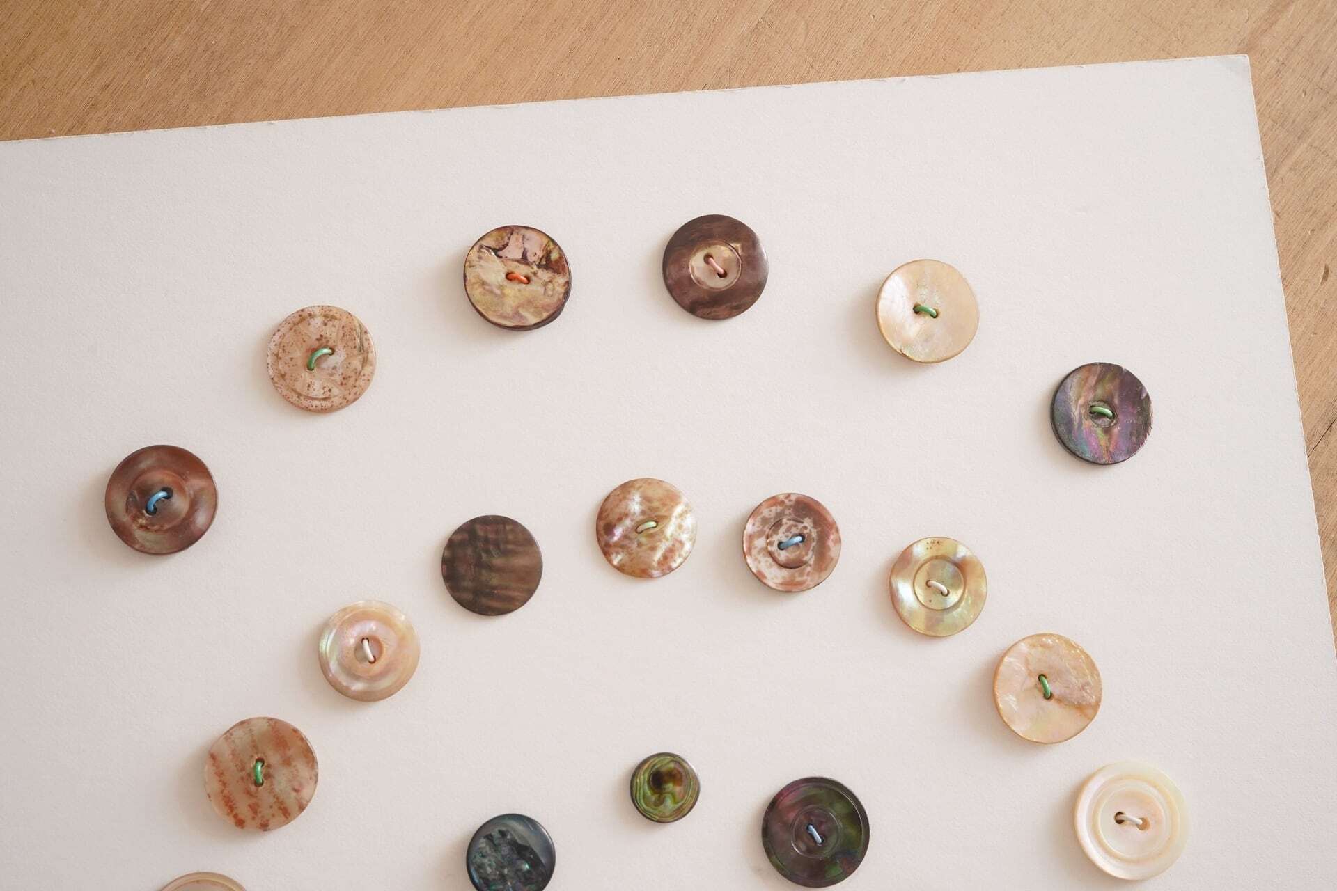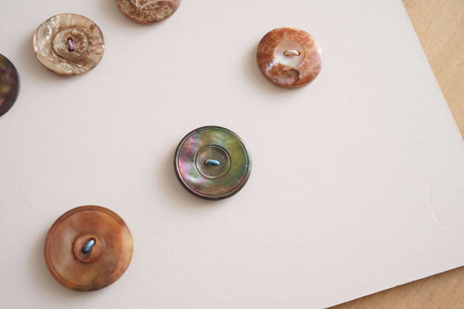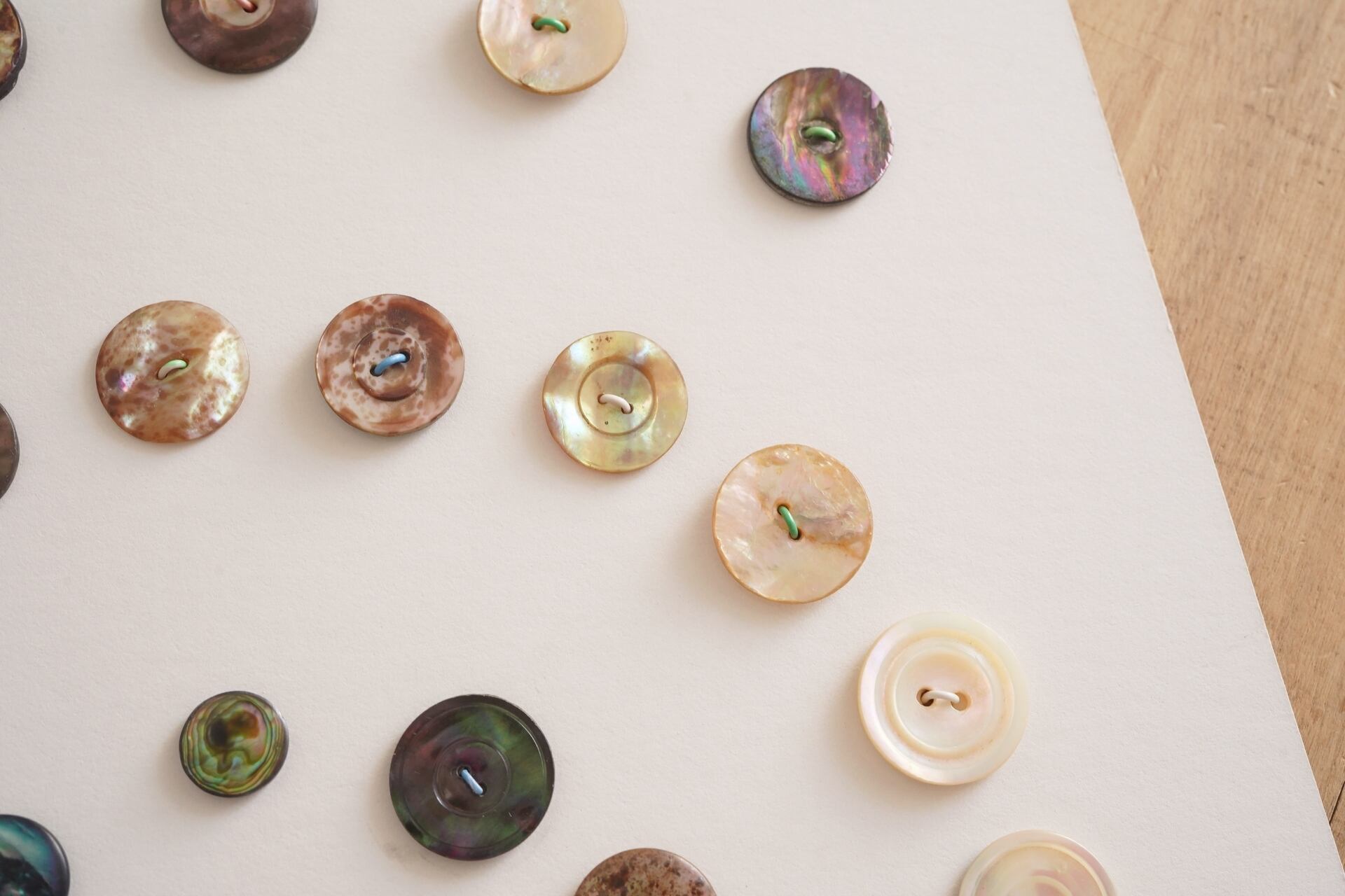 色合いや模様をじっくりと眺めたくなるようなボタンたちですね。