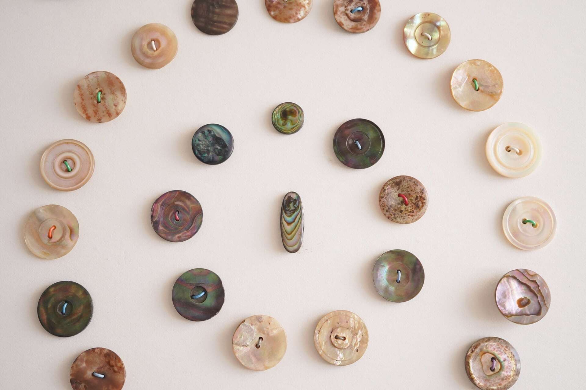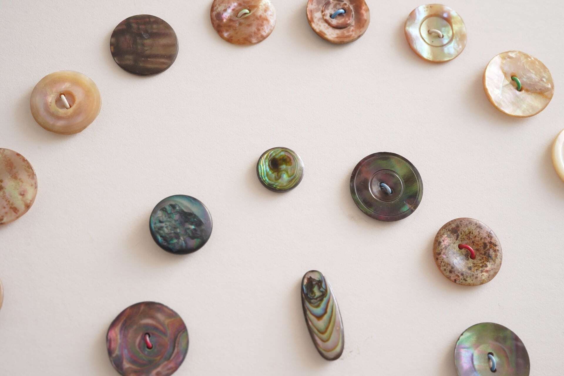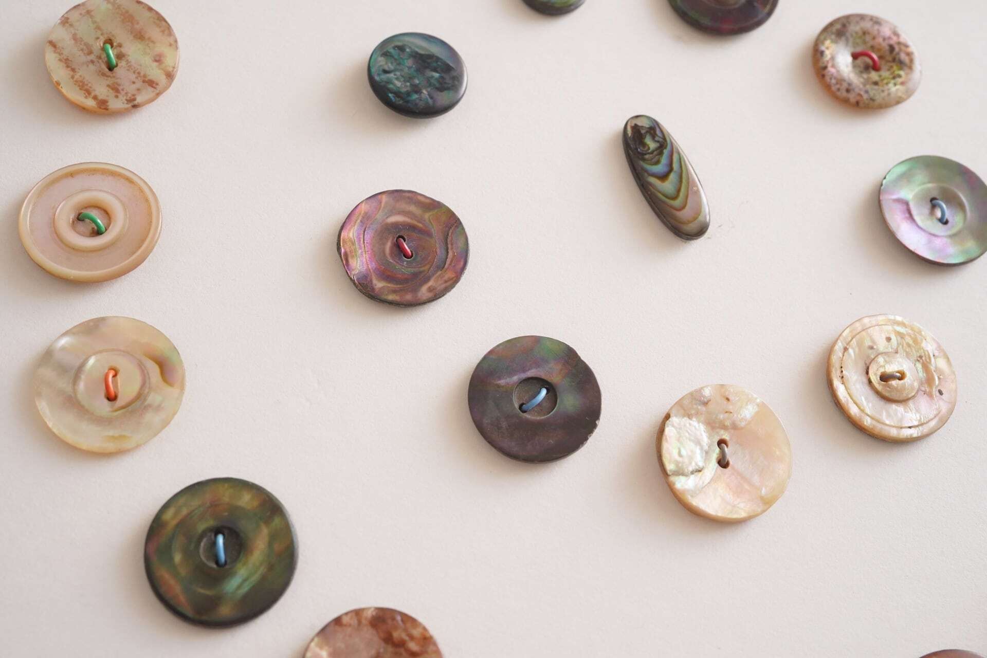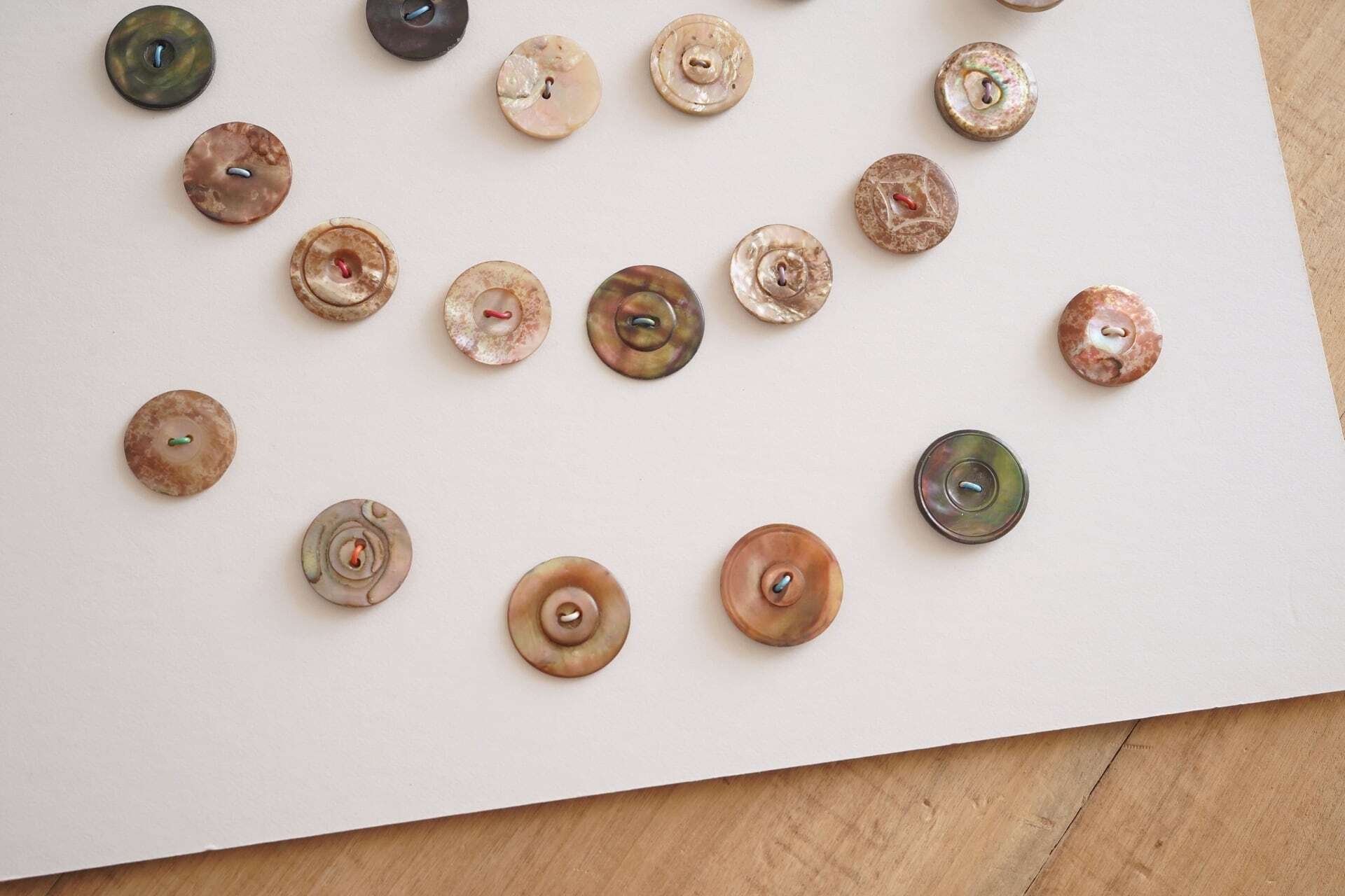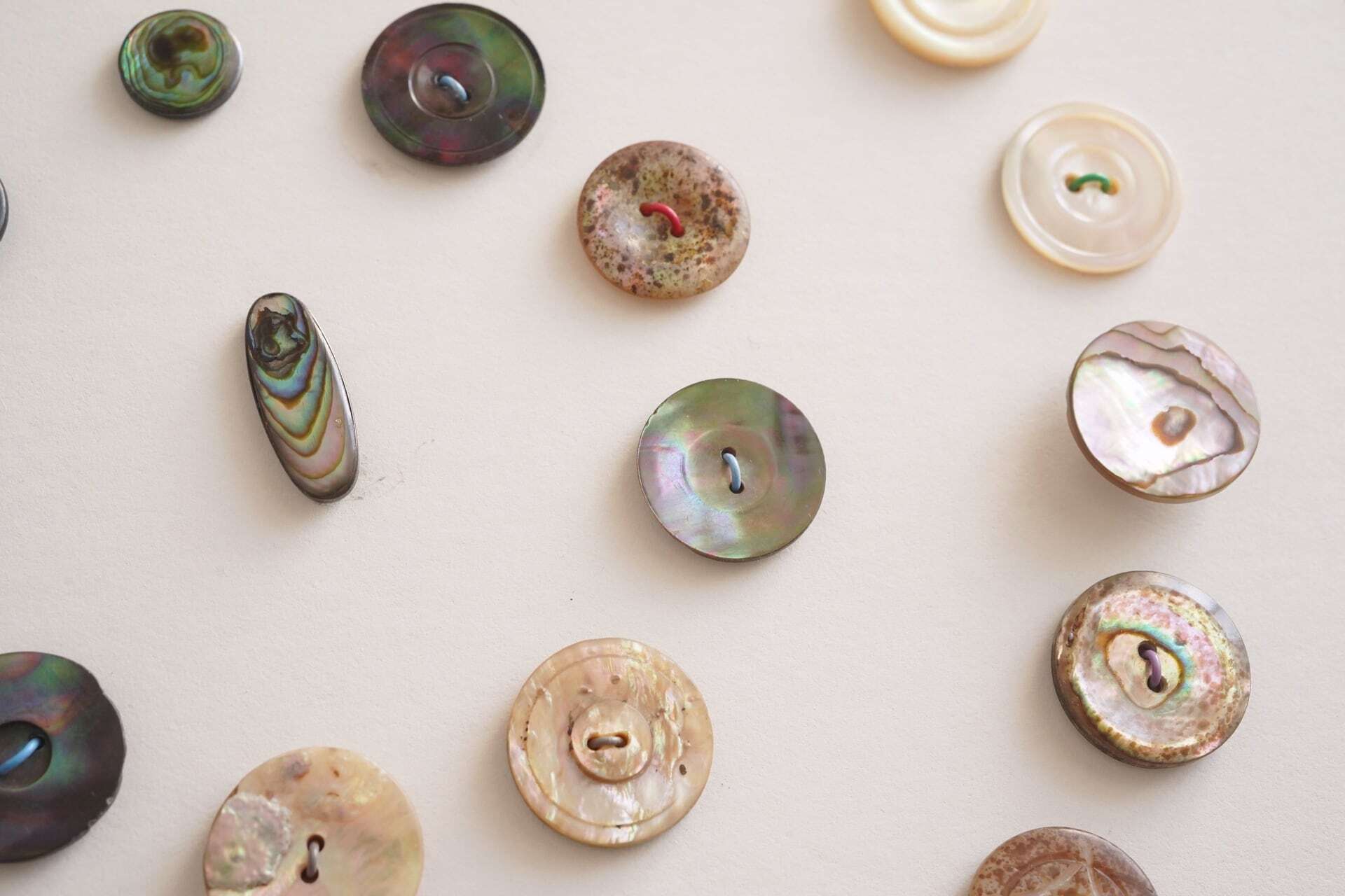 色合いや模様をじっくりと眺めたくなるようなボタンたちですね。