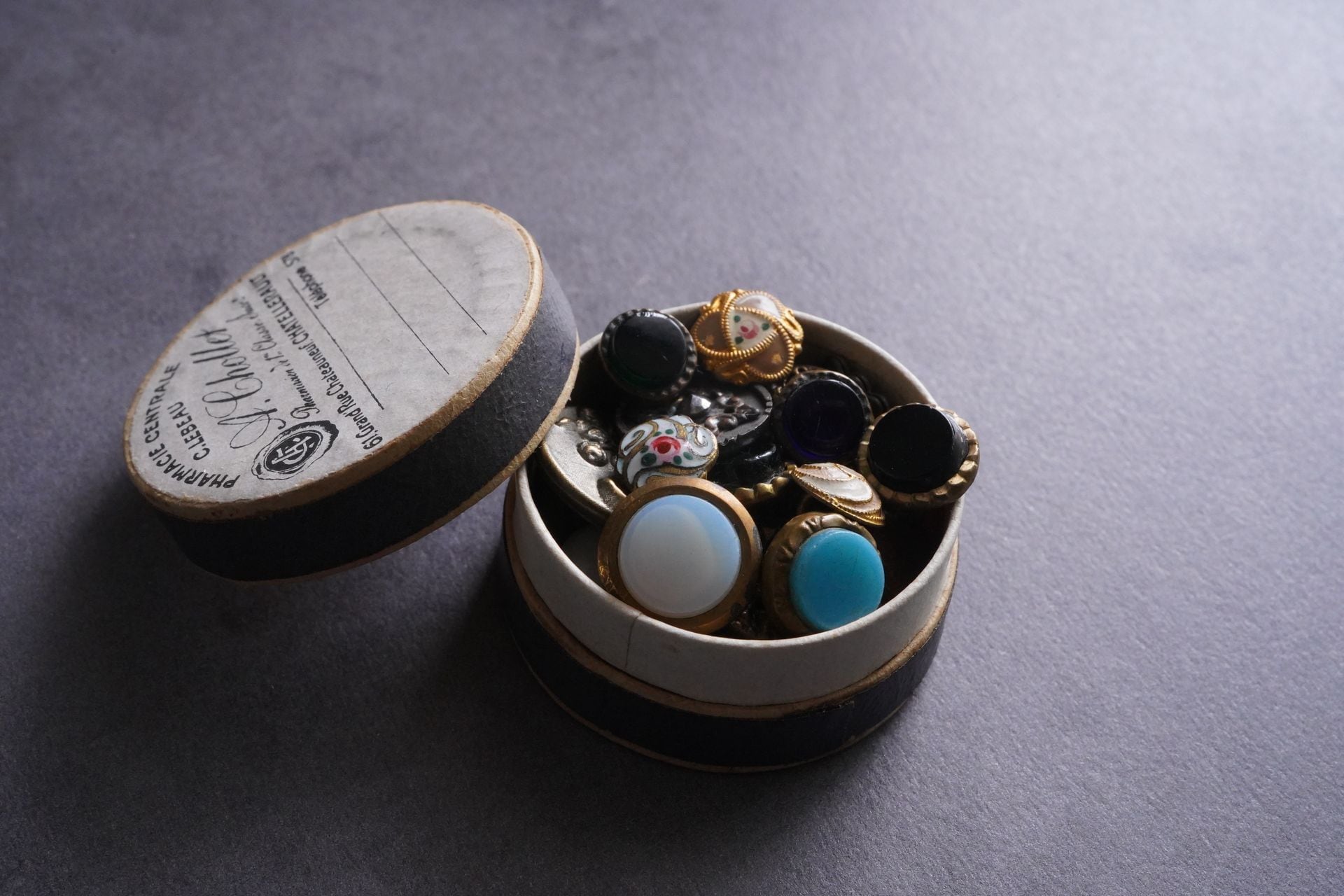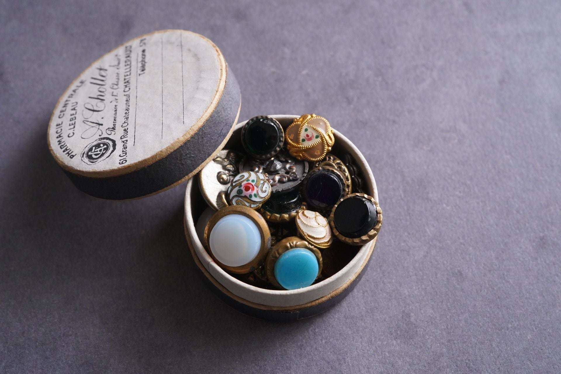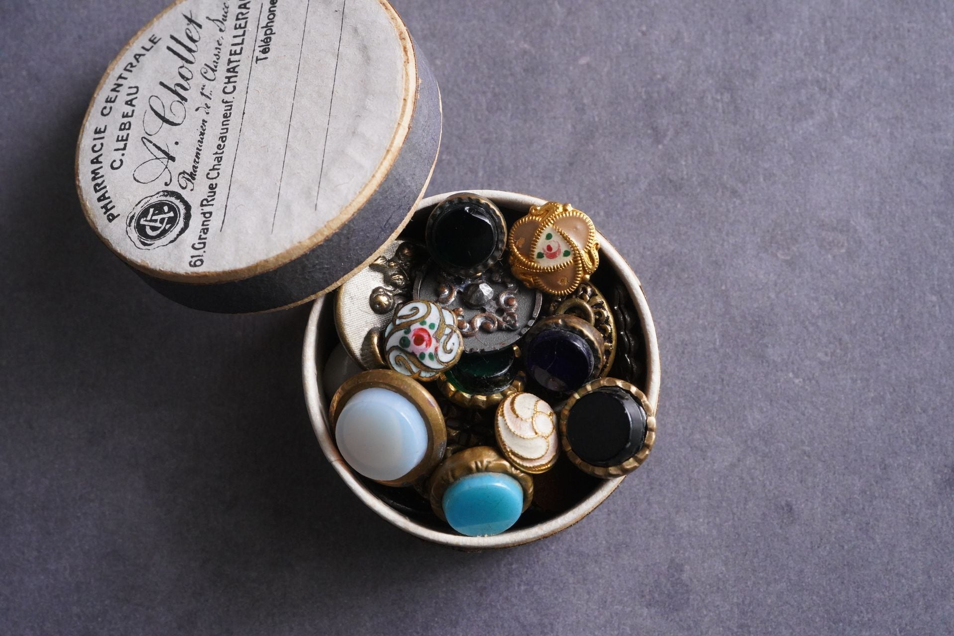 長い時を経たボタンと紙箱です、汚れやダメージ等にご理解いただける方のみご購入くださいませ。また、実用の際にはお取り扱いにお気を付け下さい。