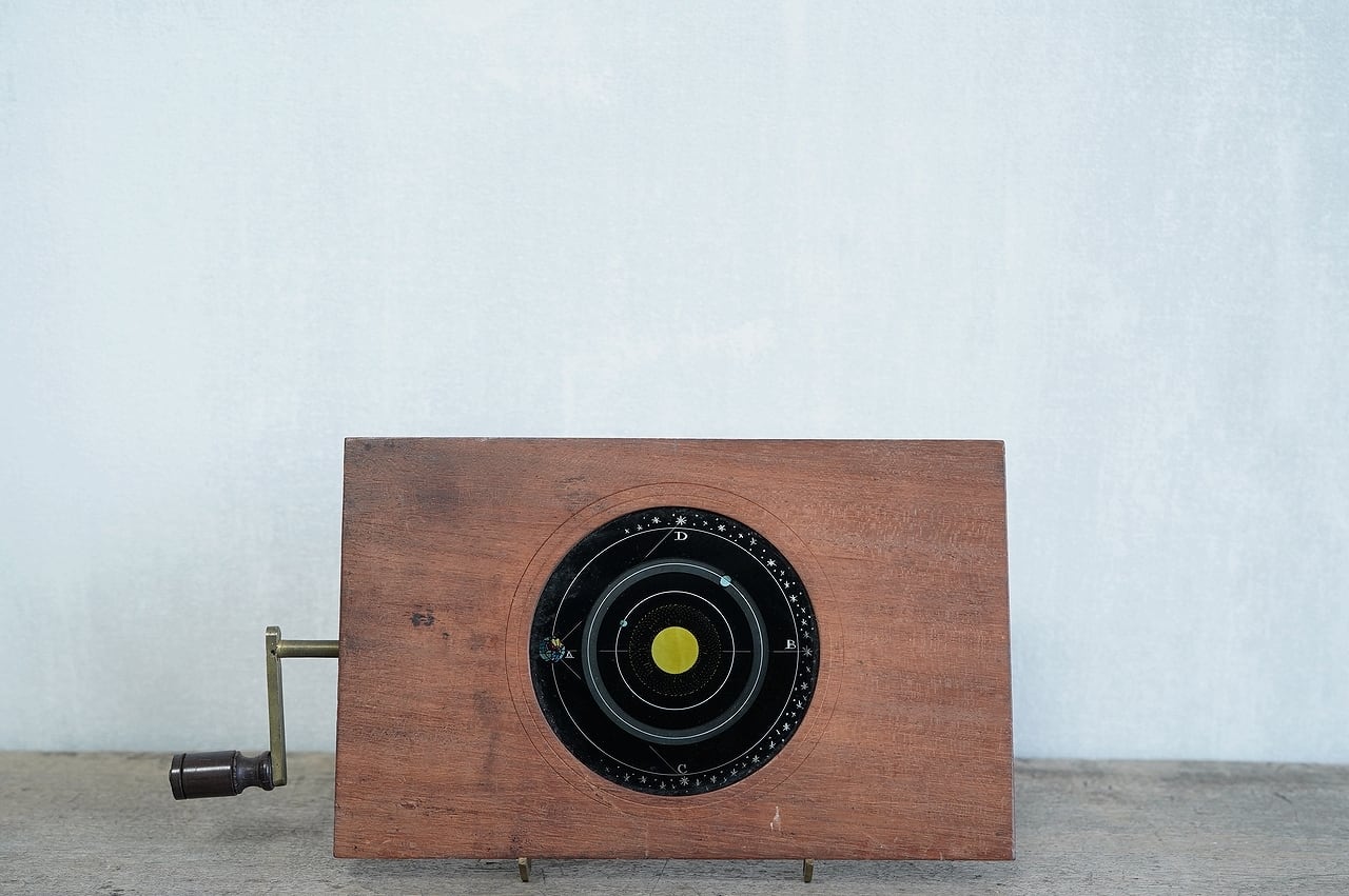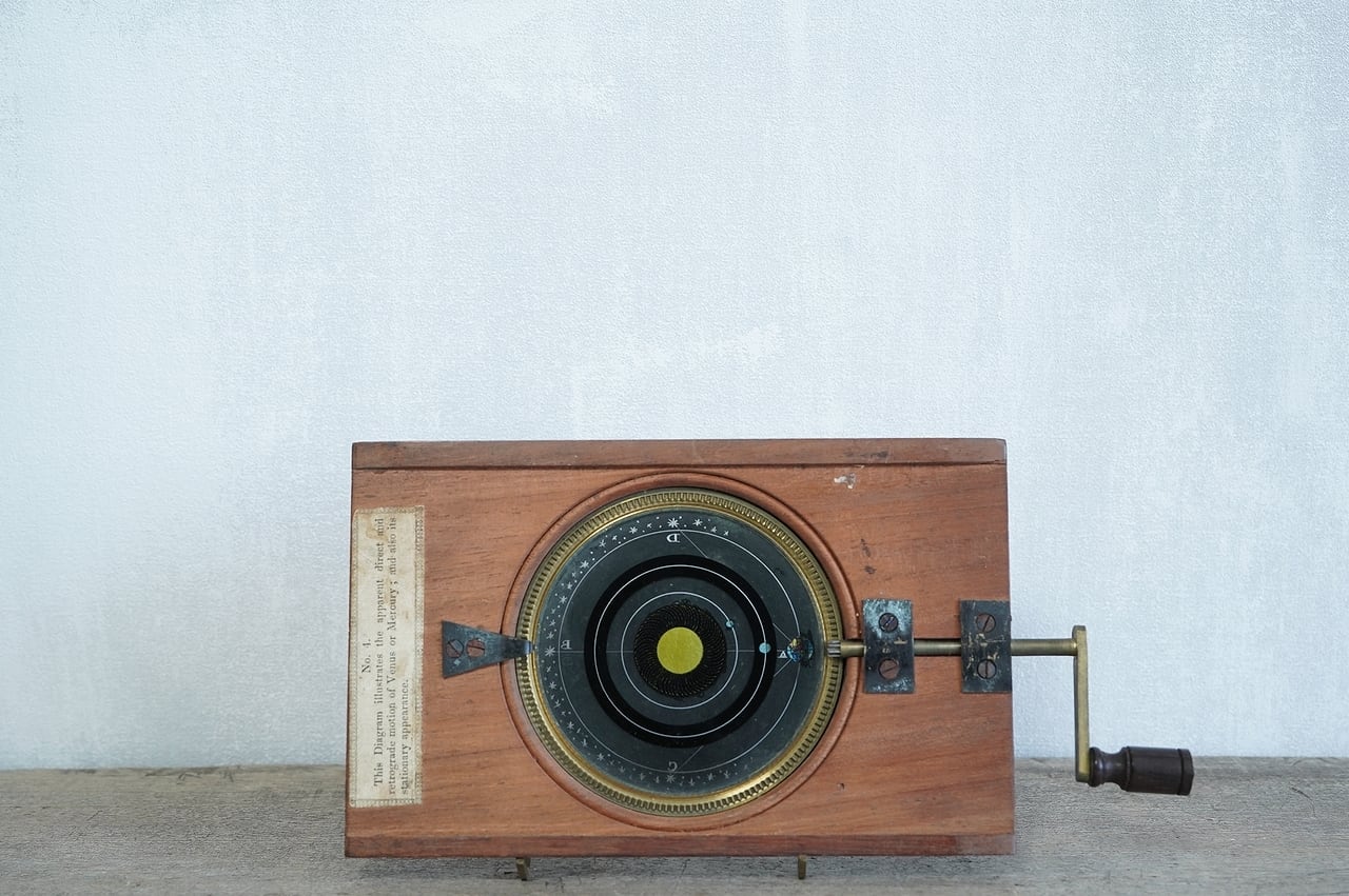 天文の教育に使われていたもので、ハンドルを回すと丸いガラスがゆっくりと回転します。