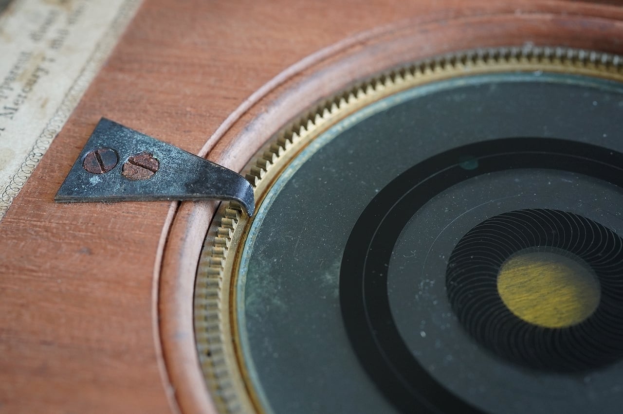 円盤状のガラスの周囲には真鍮の歯が綺麗に並び、非常に手の込んだ造りです。