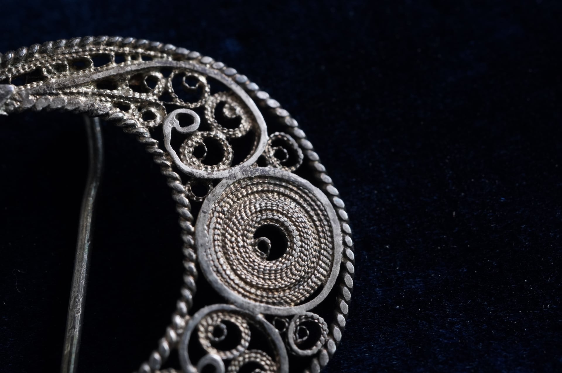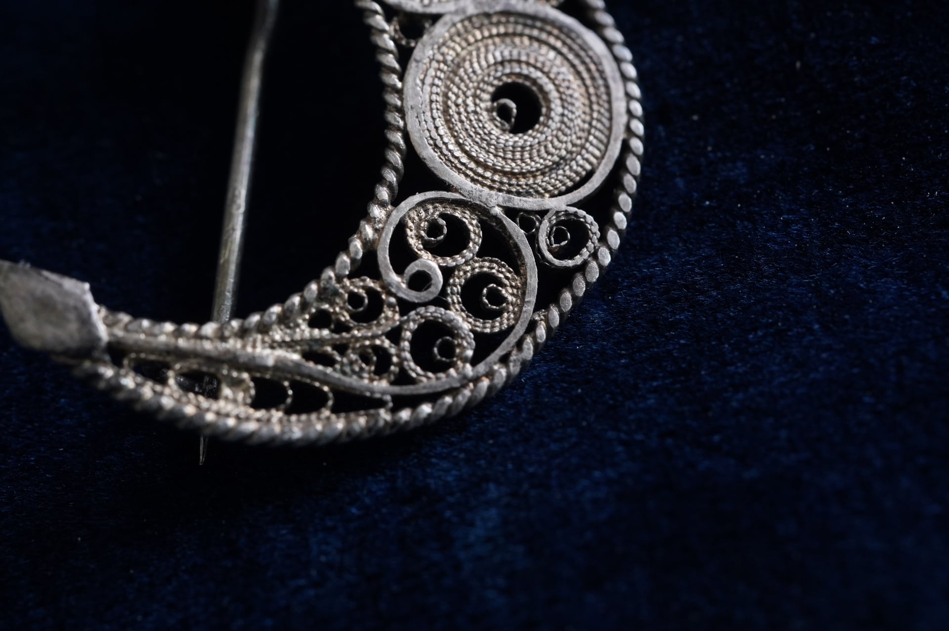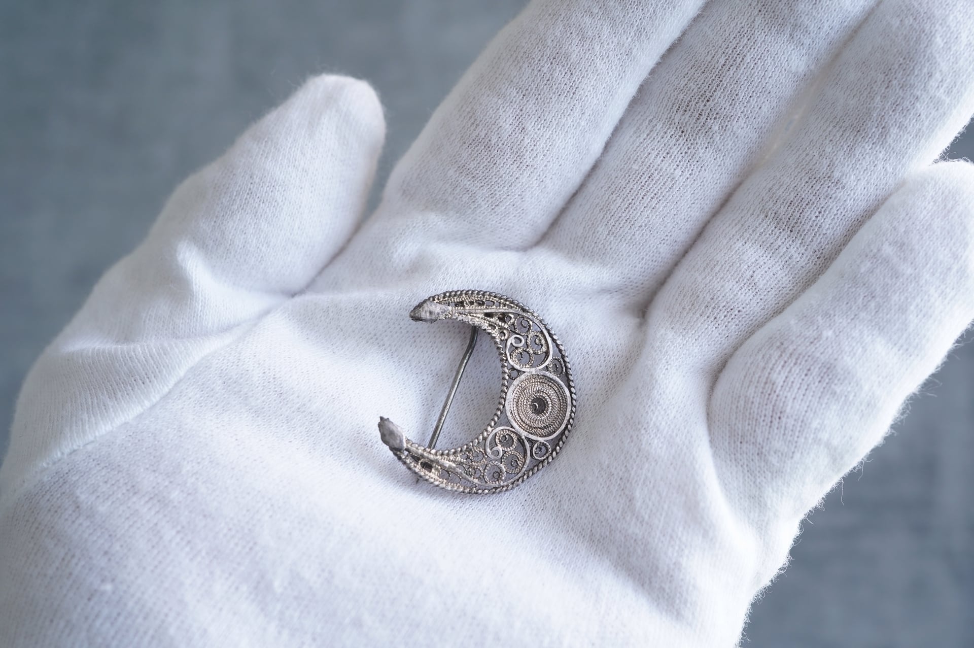 銀線細工(フィリグリー)が施された古い三日月のブローチです。