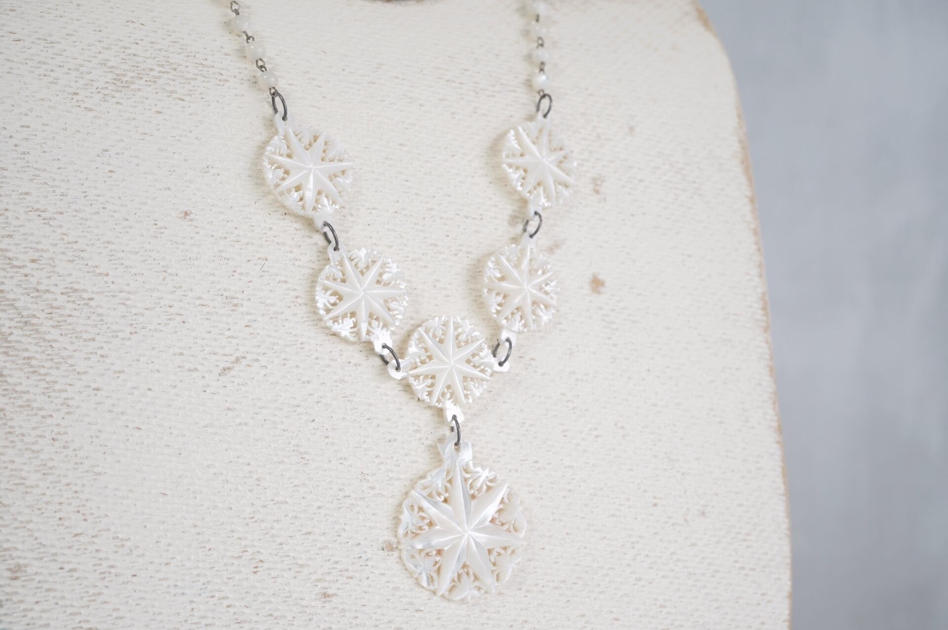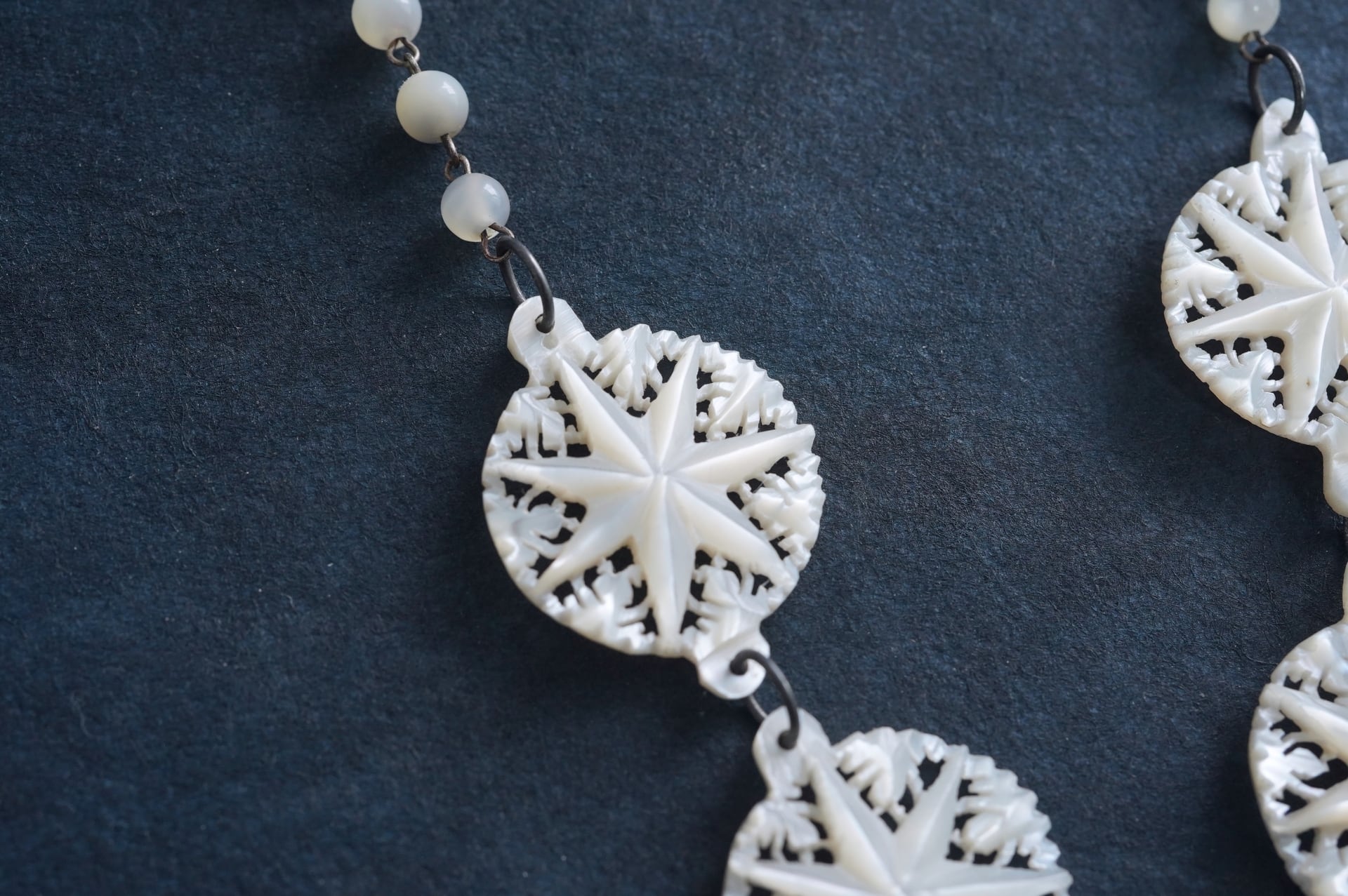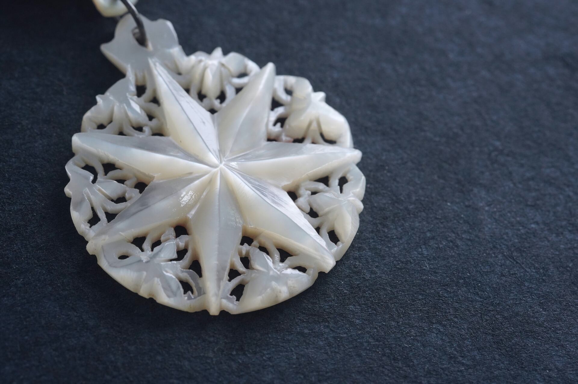 白蝶貝の手彫りパーツが6つ連なった希少なペンダント。
