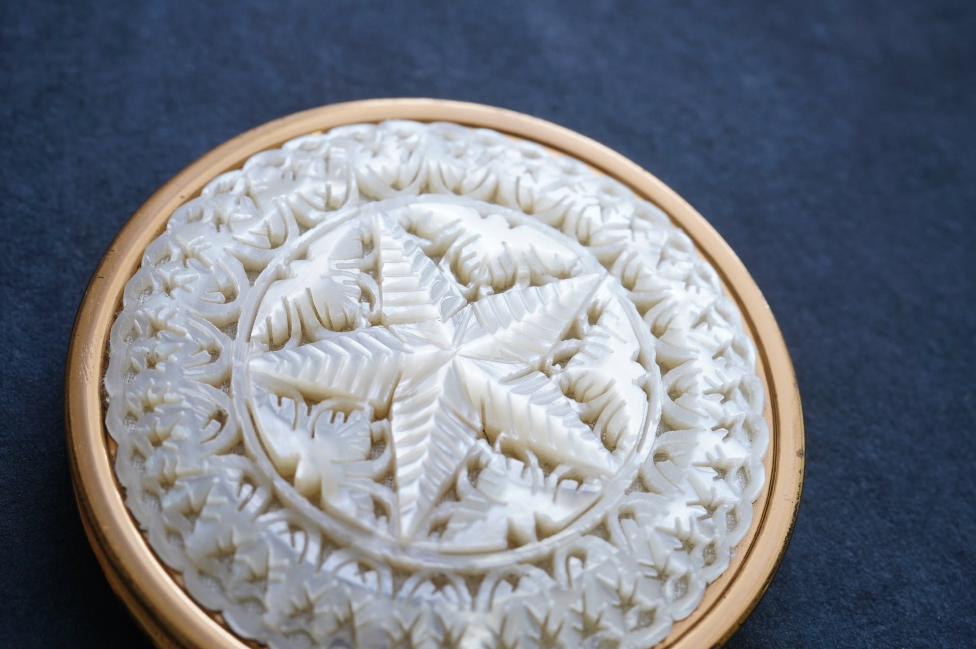 白蝶貝に手彫りが施された希少なコンパクト。