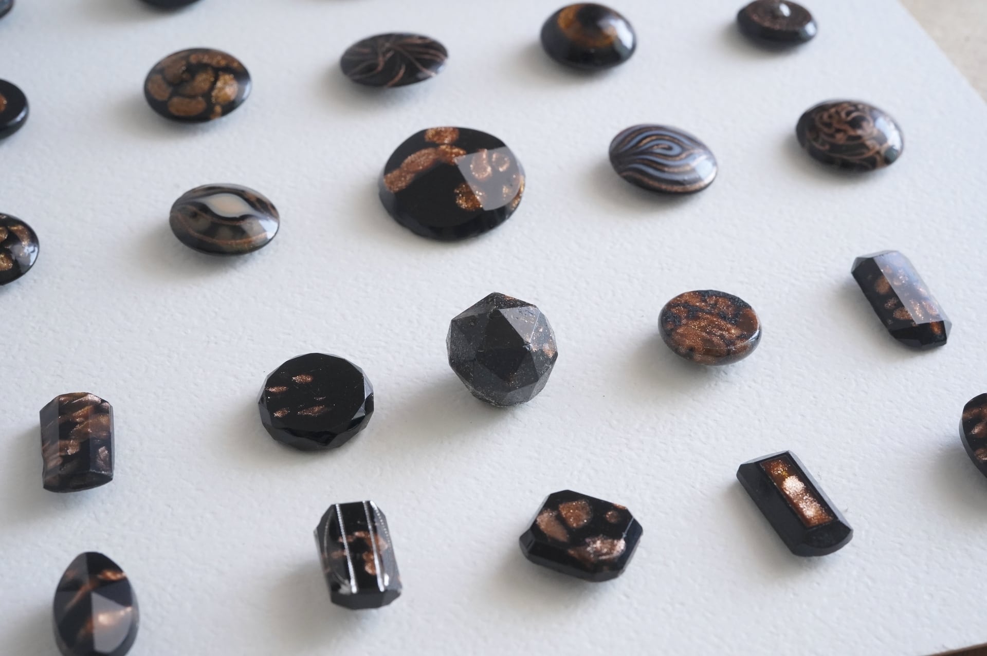 ゴールドストーンとも呼ばれるもので、硝子にコッパーを溶け込ませることによって金箔ような煌めきを放つ模様が浮かび上がっています。