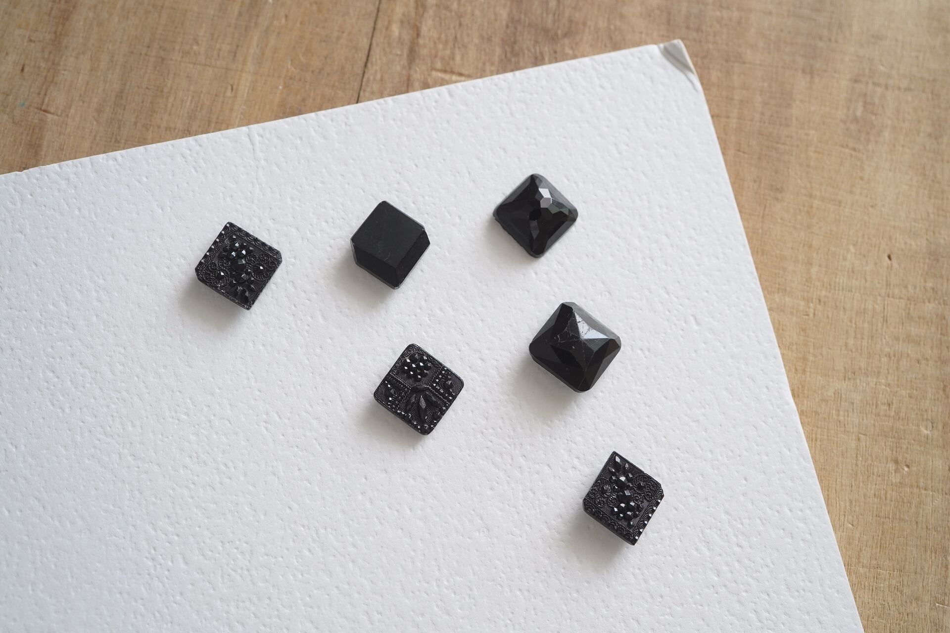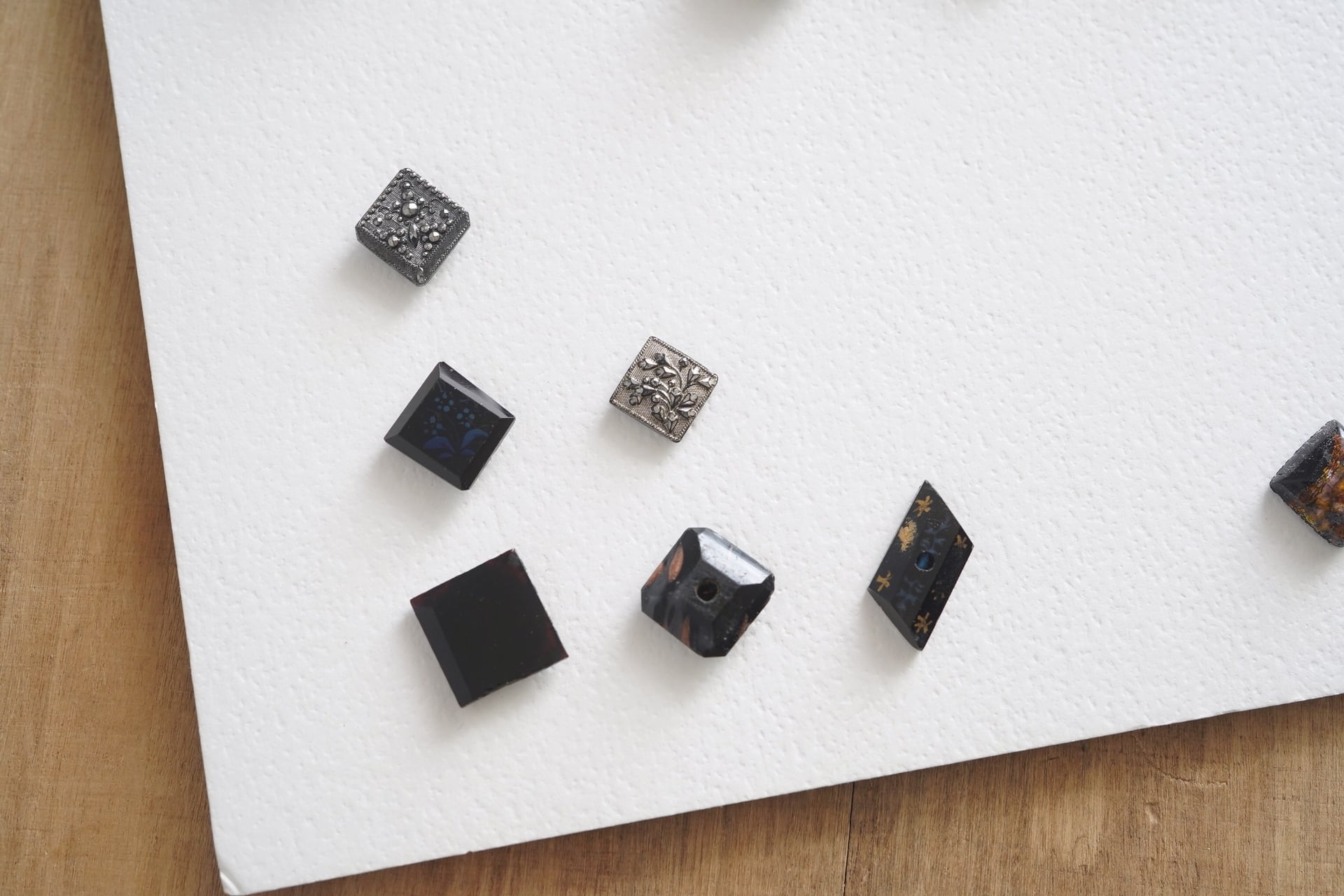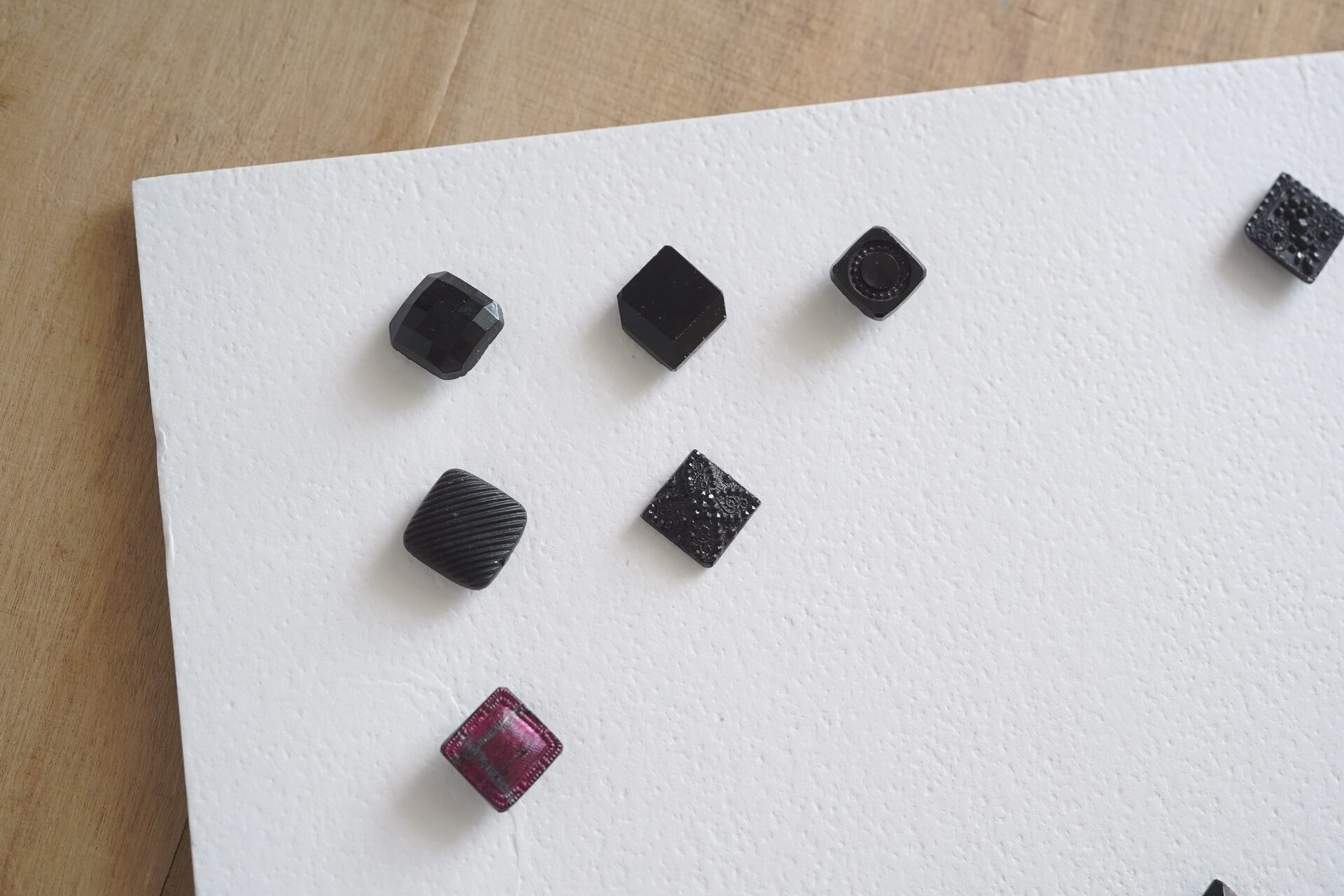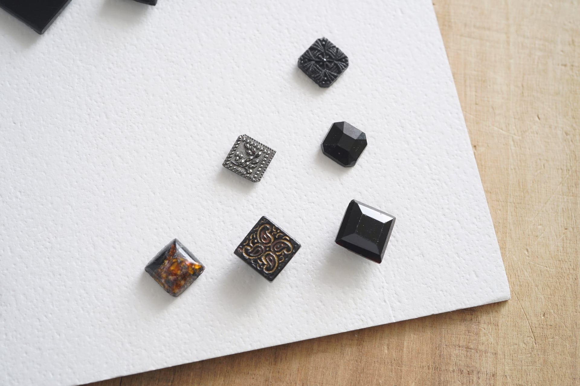 その他には黒ガラスに色を蒸着させたものや、多面デザインのボタンなど。