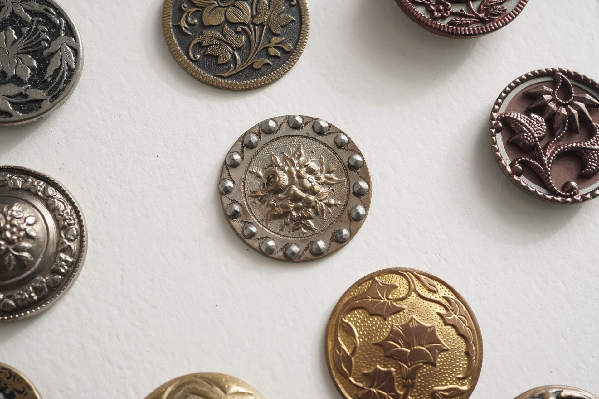 主な素材はメタルで、表面にスチールを多面カットした【カットスチール】が留められたボタンも2つございます。