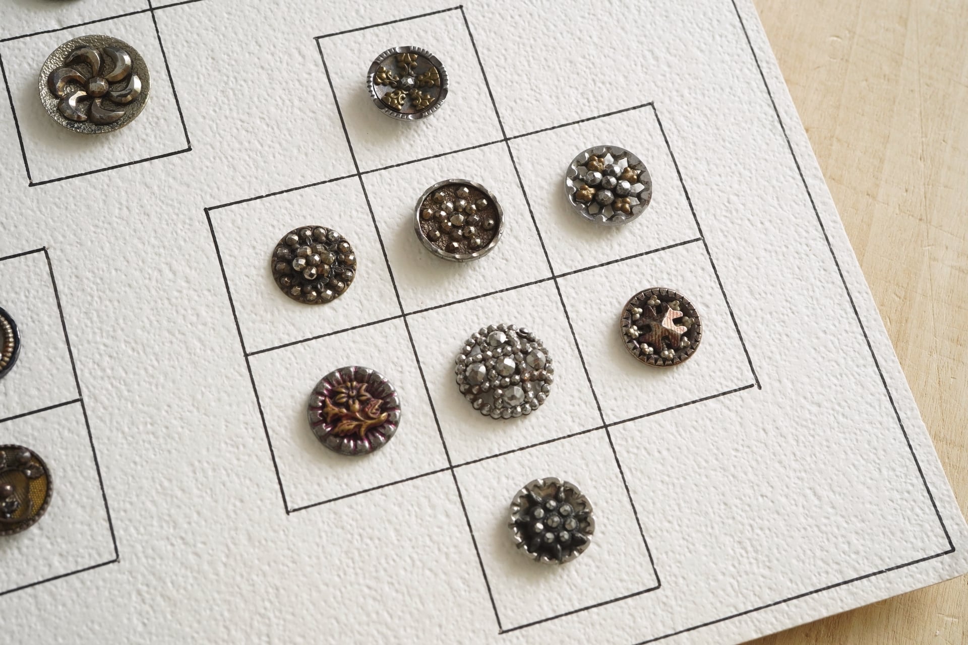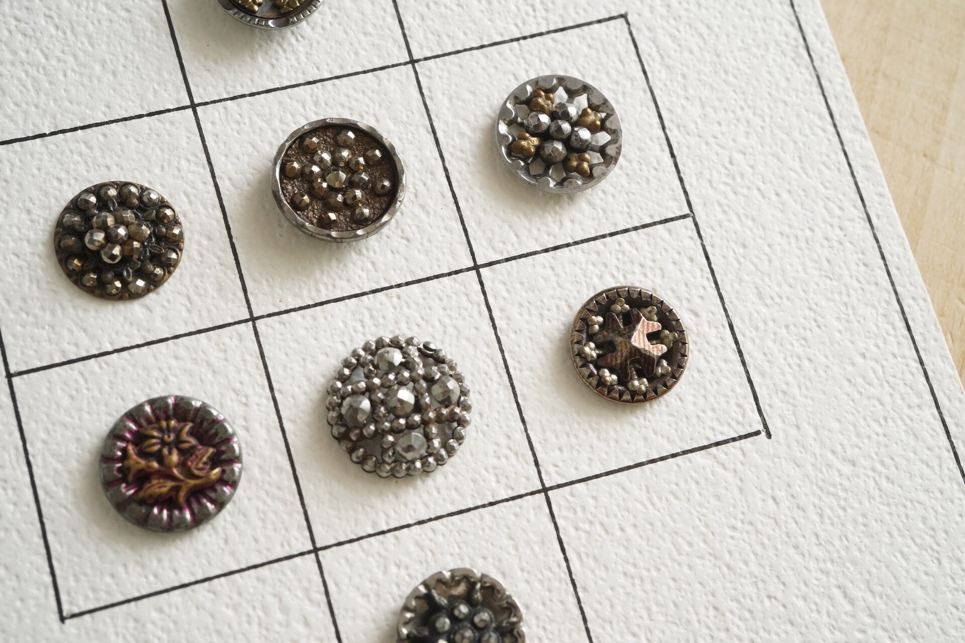 幾何学模様のようなレイアウトの中に繊細なボタンたちが佇んでいます。