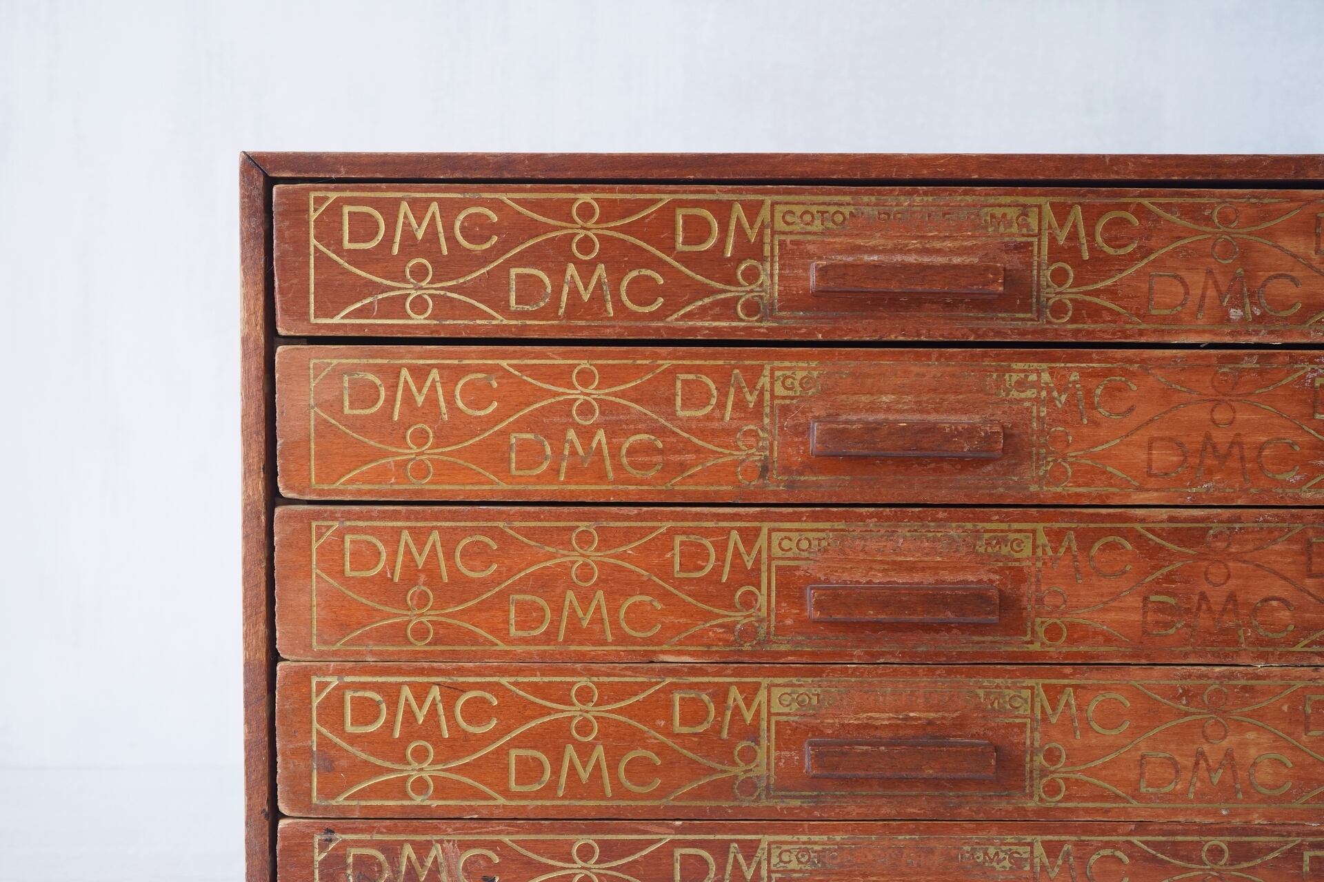 糸の陳列に使われていた木製の古い引き出しです。