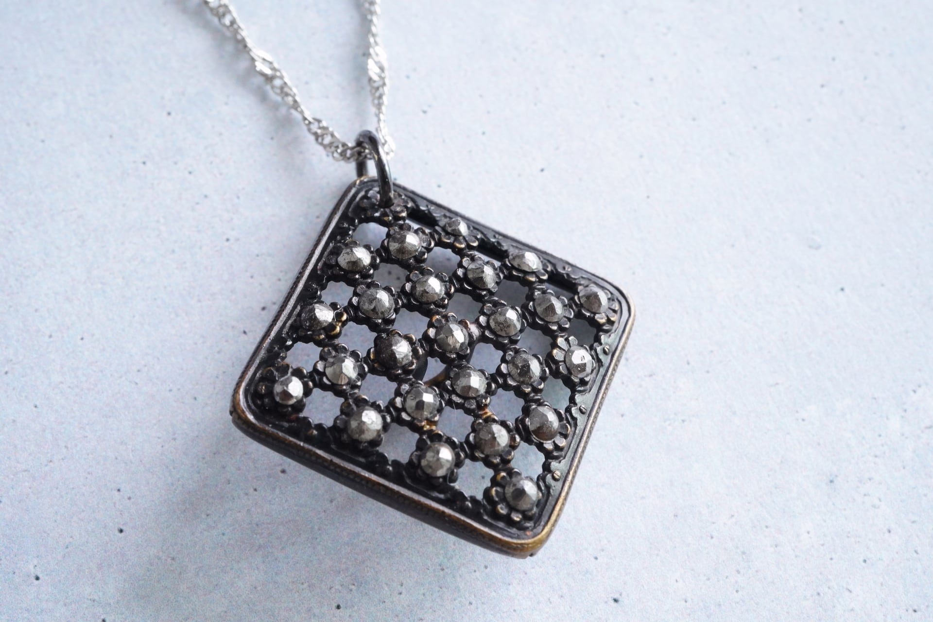 カットスチールがふんだんに使われたアンティークボタンをペンダントにしました。