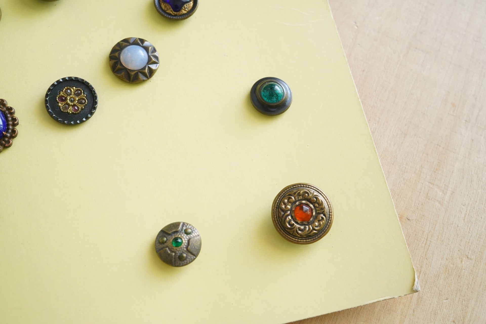 長年ボタン収集をされていた方の整理品で、まるで宝石のようなボタンたちがワイヤーやピンで留められています。