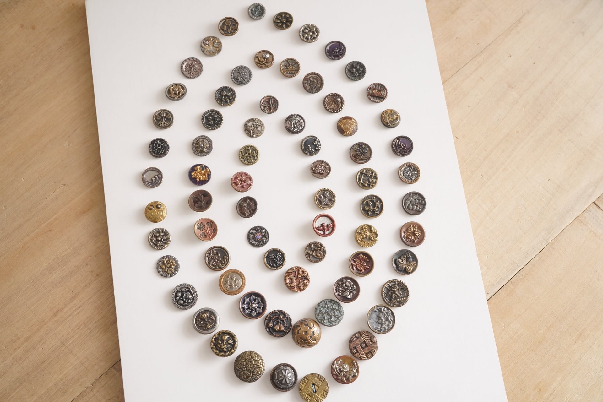 70個ものアンティークメタルボタンが留められた厚紙シートです。