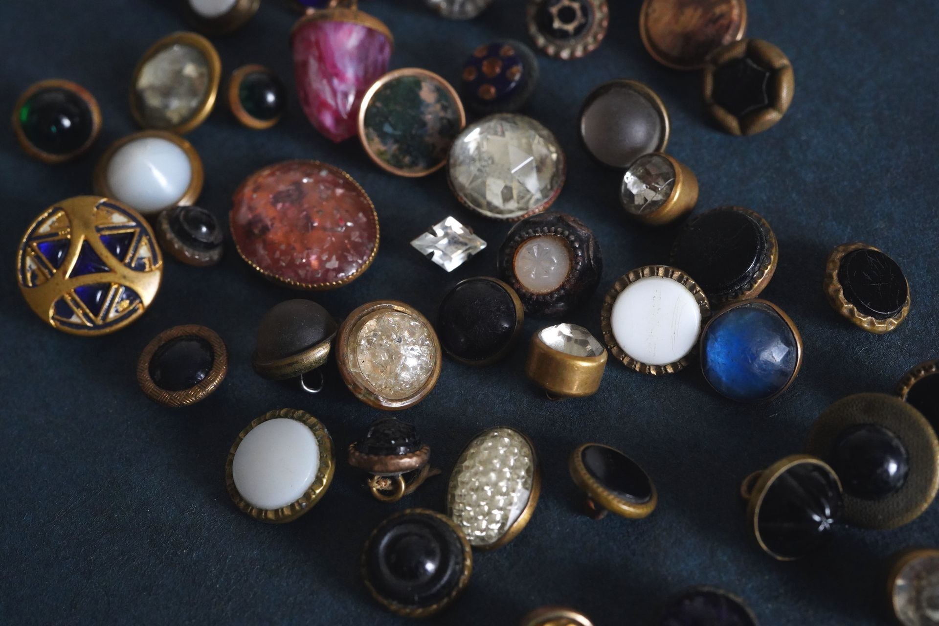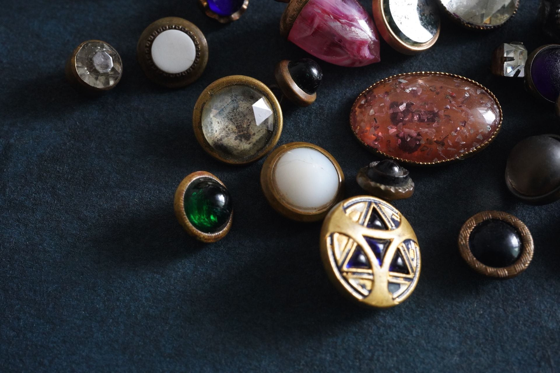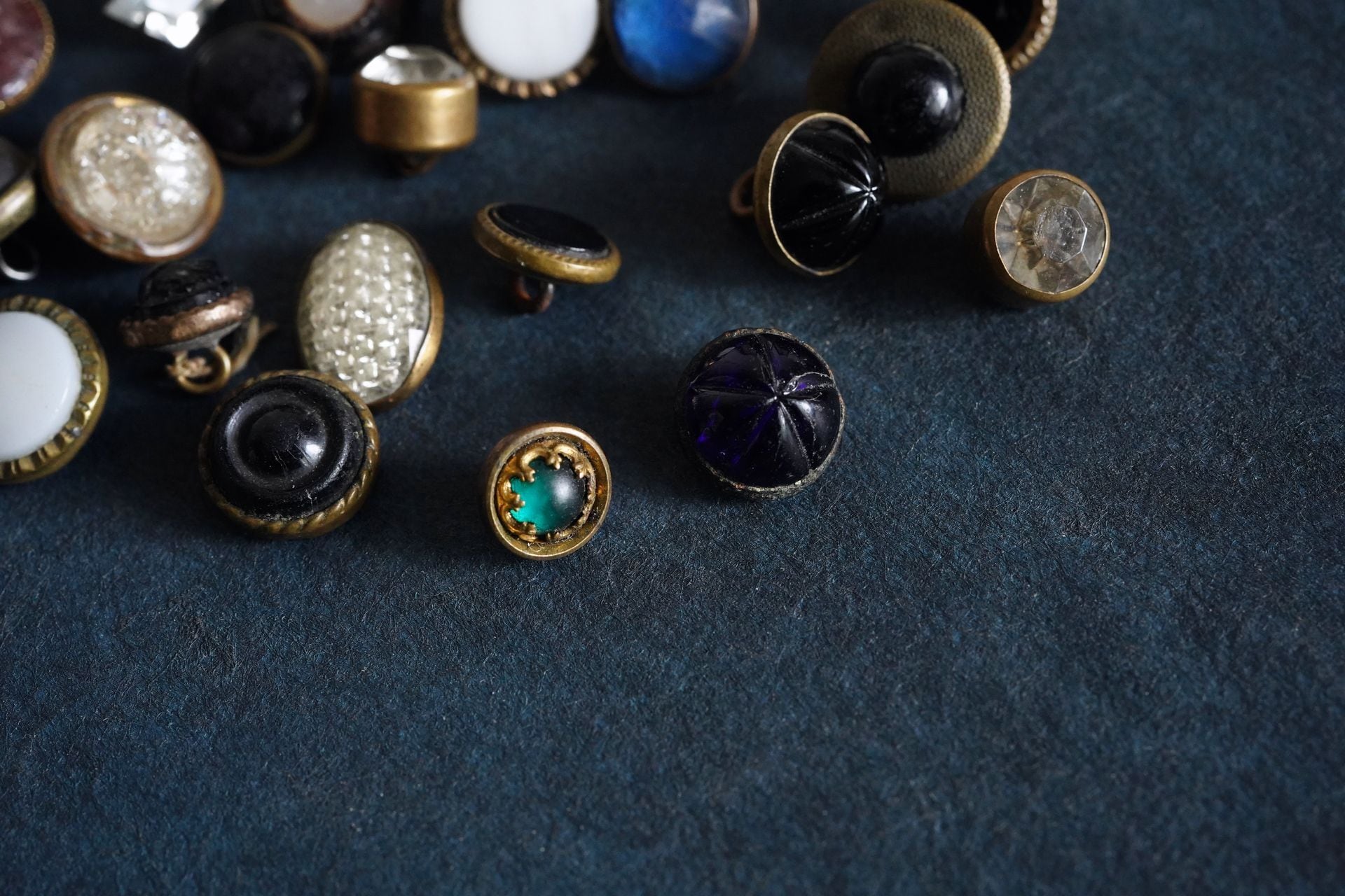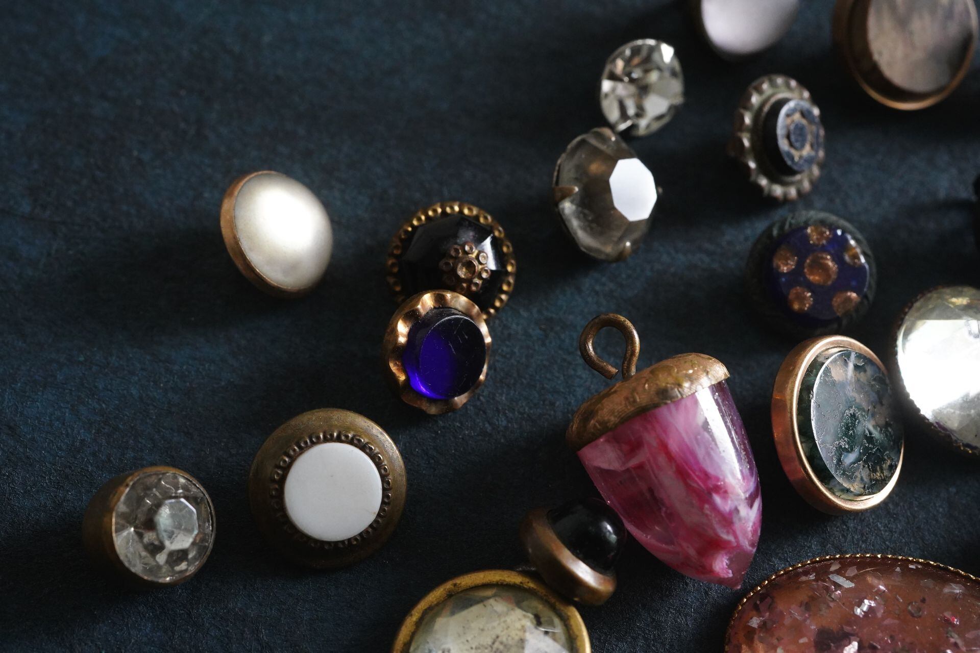 金属の土台にガラスなどの異素材を組み合わせたボタンたち。