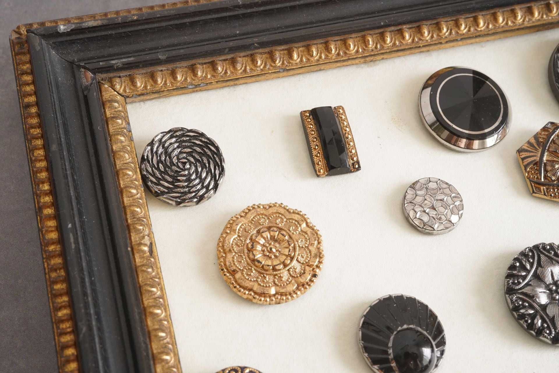 63個ものボタンが留められたシートとアンティークフレームのセットです。